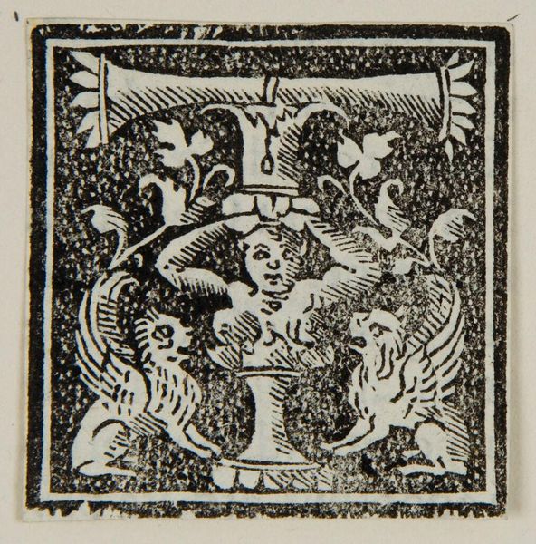 Editor: Here we have a small, intriguing woodcut called "Initial I" by an anonymous artist. It depicts a child, a dog, and a vase-like object. What do you see in this piece? Curator: I see a world steeped in symbolic tension. The child brandishing a stick suggests power, perhaps even aggression, while the dog could symbolize loyalty, or perhaps, something more feral. Editor: That's fascinating! What about the vase? Curator: The vase, adorned with foliage, may represent growth and abundance, juxtaposed against the other elements. Consider how these symbols might play out in the context of the letter "I," perhaps referencing identity and internal conflict. Editor: So the letter "I" might not just be a letter, but a reflection of our inner selves. Thank you, I will never see the letter "I" the same way! Curator: Precisely! Visual symbols often hold layers of meaning, shaping our understanding of the world, and ourselves, through art.