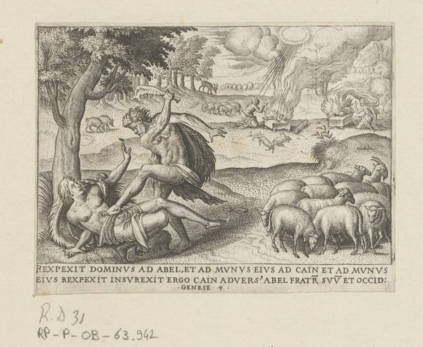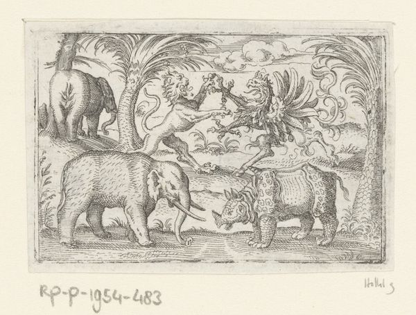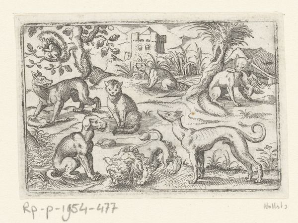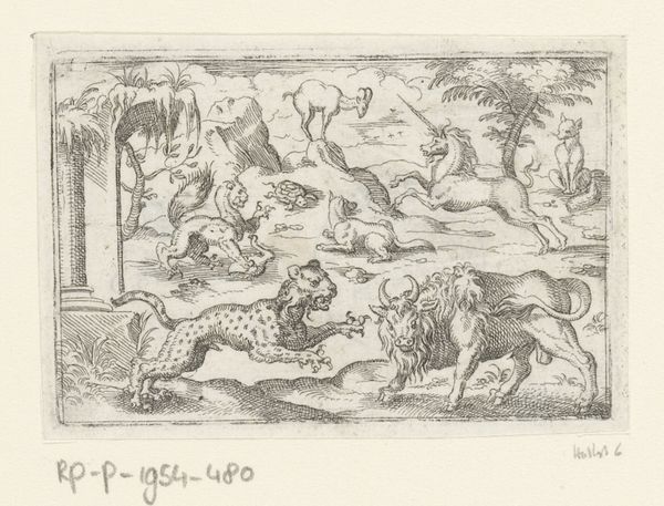 Curator: Welcome. We’re here today to explore a compelling engraving, "Zeven herten," or "Seven Deer," which dates back to the late 16th century, between 1578 and 1596. The artist, Stephan Herman, captures a lively group within a detailed landscape. Editor: It's evocative! I'm immediately drawn to the dynamic composition and its delicate details rendered in what appears to be only ink. The spatial relations between the deer create visual complexity and interest. Curator: Indeed. Consider how Herman has used line work to construct form and space. Notice how the density and variation of the lines suggest volume and texture. The hatching and cross-hatching are particularly noteworthy. Editor: For me, deer often carry potent symbolic meaning, representing gentleness, watchfulness, and connection to nature. I wonder if Herman deliberately grouped seven deer—a number holding varied cultural significance, from wholeness to luck, influencing the print's interpretation? Curator: Intriguing speculation. From a purely formal perspective, though, the seven deer offer an almost musical variation on a theme. The arrangement allows Herman to play with perspective, scale, and proportion, contributing to a structured rhythm across the piece. Editor: Yet, despite the controlled technique, the artist communicates a sense of wildness, a life force. Deer appear frequently in mythology and folklore, sometimes embodying spirits of the forest or acting as messengers. I feel an invitation into the space to contemplate their significance. Curator: One can certainly feel that invitation, though for me the emotional draw stems from the way Herman balances intricate detail with an overall sense of compositional harmony. The stark contrasts and rhythmic placements create a satisfying visual experience independent of narrative meaning. Editor: I see your point. This piece can clearly be approached from several angles—it works as a compelling visual study and also, I think, prompts considerations of symbolism and cultural heritage. I'll leave today with a newfound appreciation for both viewpoints. Curator: A fitting summary. "Zeven herten" certainly provides a remarkable testament to Herman's technical skill and artistry, leaving viewers like us contemplating line, form, and enduring symbology.