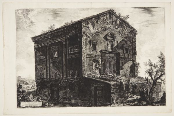 This is one of Giovanni Battista Piranesi's Vedute di Roma, or Views of Rome, rendered in etching. It presents a tableau of classical ruins, dominated by stark contrasts of light and shadow. The architecture looms large, its decaying surfaces meticulously detailed with dense, cross-hatched lines. Piranesi masterfully uses scale to evoke the grandeur of the Roman Empire, while simultaneously underscoring its fall. The minute figures scattered amidst the ruins emphasize the vastness and desolation of the scene. The composition is carefully structured to lead the eye through layers of architectural fragments, each plane rendered with precise detail. This technique not only creates a sense of depth but also invites reflection on the cyclical nature of history and the transience of human achievement. The play of light across the textured surfaces adds an emotional intensity, evoking both awe and melancholic contemplation.
