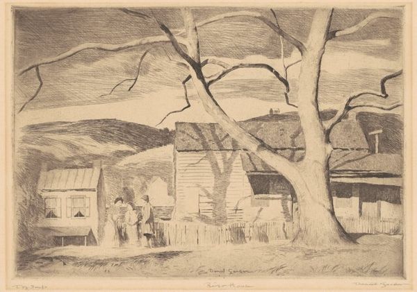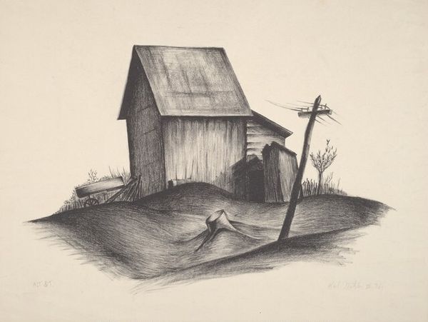 Curator: Gazing at this image, I feel instantly transported to a quiet coastal morning. The subtle gray shades create a gentle, almost dreamlike stillness. Editor: Stow Wengenroth created "Down East" in 1958 using graphite, in the print medium, this particular image stands as a prime example of his dedication to realism tinged with Modernist sensibility. What's fascinating about his work is how he merges these styles within the genre of landscape art. Curator: Oh, definitely. I mean, it’s realistic in its depiction of the buildings and the water, but there’s something else there, an almost abstract quality. The light feels both present and absent, lending it a sort of eerie peace. Like a memory you're trying to hold onto. Editor: Wengenroth made most of his images along the New England coastline and the area’s artistic history plays a vital role. The 20th century, particularly after both World Wars, saw artists and writers explore themes of solitude and resilience, seeking a refuge in nature as the landscape held a vital connection to culture during periods of national and personal uncertainty. This historical context certainly emphasizes that emotional response you have to this art piece. Curator: Exactly. The image just breathes contemplation, like a visual poem capturing the silent dialogue between the man-made structure, like a lighthouse, and nature's endless embrace. Editor: And I think that also invites viewers to consider our current engagement with these natural spaces and its historical place. The very act of framing the landscape changes our connection with it, imbuing it with a sense of ownership and responsibility. This image almost silently proposes a dialogue about sustainability and art's function in social commentary. Curator: I love that. It reminds us that art, even in its quietest forms, can make us consider broader concerns. The image isn't just scenery; it’s an experience and a statement. Editor: Absolutely. Wengenroth provides more than just representation here. This graphite print provides historical commentary, connecting landscape art to a larger social framework. It encourages discussions about artistic value and political concerns in public art spaces. Curator: That’s powerful.
