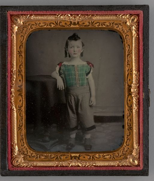 Editor: Here we have an untitled portrait of a boy standing, a daguerreotype made around 1848. The boy looks so serious, almost melancholic. He’s dressed formally and standing stiffly next to a table with flowers. What do you see in this piece from a historical perspective? Curator: Well, it's important to remember the social context of the daguerreotype. Photography was relatively new, expensive, and primarily available to the upper classes. This portrait signals social aspirations and projects the family’s financial success to future generations. Editor: It’s interesting that you mention aspirations. To me, it feels very posed, and in a way, forced. Do you think that rigidity had any function in culture? Curator: Absolutely. In that era, portraiture, especially photographic portraiture, performed an important role. Families gained social standing and cultural capital from images, as a way to express status. The flowers in the background can symbolize beauty and wealth. Everything would have been carefully selected to make a specific impression on the viewer and reflect on the sitter. Editor: That's fascinating. So it's less about capturing a spontaneous moment and more about constructing a public image? Curator: Precisely. Also, it makes you think about who made this photograph possible, where was this taken? Editor: That really changes how I see it. I initially perceived a sad little boy, but now it feels like a deliberate presentation for social advancement. Curator: And that's how historical context reshapes our understanding and the social function of this piece.