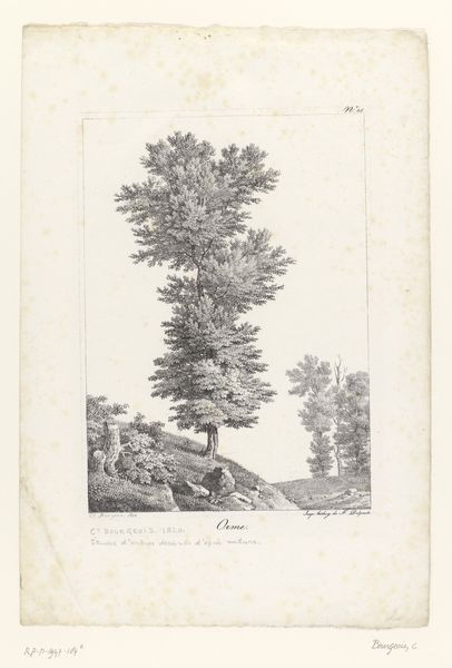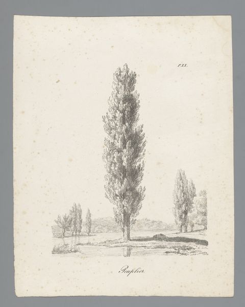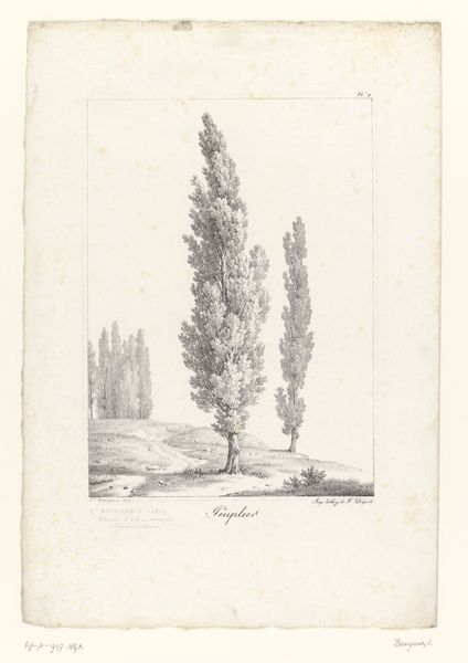 Curator: Standing before us is "Cipres", a pencil drawing created around 1820 by Constant Bourgeois. Editor: My initial impression is one of tranquil solemnity. The delicate rendering in pencil creates a scene that feels both meticulously observed and imbued with a gentle melancholy. Curator: Indeed, cypress trees themselves have carried potent symbolism for millennia. In many Western cultures, they're associated with mourning and remembrance, often planted in cemeteries. This association stems from ancient beliefs about their connection to the underworld. Editor: That history certainly resonates. The upward thrust of the trees, captured with such precision, feels like a reaching towards something beyond, perhaps even a transcendence of earthly concerns. Note the subtle variations in line weight; it adds depth and texture, highlighting the formal aspects of the composition. Curator: And let's not forget their association with immortality, too, the idea that the soul endures. The landscape almost feels like a memory or a dream. Notice also the small house in the background on the left? Its position and style suggests to me the integration of life and death in the daily living space, common during this era. Editor: A clever counterpoint! While the composition leans toward Romanticism with its appreciation for the sublime, the rendering is more aligned to the realism present in Neoclassicism. See the intricate detail Bourgeois achieves, despite the limited tonal range of the medium. It reminds us of the careful observation underpinning even the most emotional artistic expressions. Curator: Bourgeois clearly wants us to consider the intersection of the temporal and the eternal, using the cypress as a visual conduit. These trees visually memorialize the intersection of history, emotion and spirituality. Editor: A fascinating interplay of form and content—thank you for illuminating the historical and symbolic resonance woven within its subtle textures. Curator: My pleasure. I found myself appreciating how this singular tree could invite reflection upon mortality itself.