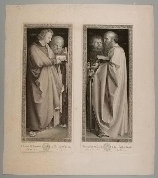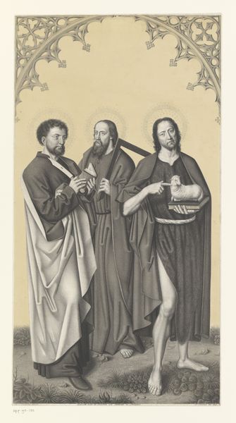 Curator: Welcome. Today, we're looking at "Heilige Paulus, Simon en Filippus," an engraving from 1824 by Johann Nepomuk Strixner. Editor: Wow, quite formal, isn’t it? They all look like they're posing for a very serious band photo, complete with props and halos, ha! Curator: The composition does strike a formal pose, indeed. Note how the three figures—saints Paul, Simon, and Philip—are presented frontally and in equal measure, arranged under an embellished arch. Each element seems meticulously planned for maximum clarity and didactic impact. Editor: Didactic for sure. The props really tell the story, don't they? One has a cross, another has a book, and the other a…rather intimidating-looking sword. Curator: Precisely. The attributes of each figure, the cross, book, and sword, serve as visual signifiers, offering clues to their identity and roles within Christian narratives. Furthermore, observe the contrasting textures rendered solely through engraving: the softness of the robes against the hardness of the metallic elements. Editor: I get what you’re saying, the use of monochromatic values for contrast definitely emphasizes the tangible presence of those textures, and really brings their different spiritual authority to light too. Is that fair to say? Curator: Yes, the contrasting material depiction emphasizes their sacred nature, certainly, reinforced by the inclusion of the three halos. Notice, also, how their gazes converge towards the viewer, suggesting an engagement, an almost beckoning presence. Editor: And yet, for all their posed solemnity and clear symbolism, I still feel this peculiar tension. Is it perhaps in the fact that all three of them have the same Romanesque bare feet and sandals, adding some earthly relatability? I feel it kinda gives a human touch. Curator: Indeed, the choice of barefoot figures amidst the grandeur serves as a counterpoint, humanizing the divine, reminding us that the spiritual exists also within the corporeal. A subtle yet crucial nuance in understanding the print’s layers of meaning. Editor: It all makes for a surprisingly complex, slightly ironic effect given its academic leanings. It's got me thinking about authority, presentation, and human nature... Not bad for an old engraving. Curator: And in considering the convergence of symbol, composition and affect, we enrich not only our perception of this print, but potentially of ourselves as well.