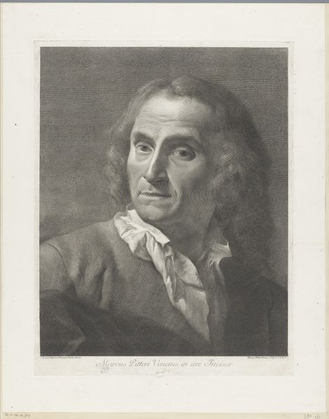 Giovanni Marco Pitteri created this portrait of the painter Giovanni Battista Piazzetta using etching and engraving, techniques deeply rooted in craft. Look closely, and you'll see how the fine lines create a sense of depth and texture, almost as if you could reach out and touch the sitter’s face or feel the weight of his robe. Pitteri’s skill with these tools is evident in the intricate details of the face, capturing Piazzetta's character and conveying a sense of his presence. Engraving and etching demanded meticulous labor, a stark contrast to the often-romanticized idea of artistic creation. This work is a reminder that art-making is also work, deeply embedded in social and economic contexts. The rise of printmaking allowed for wider distribution of images, connecting art with the burgeoning world of commerce and consumption. Understanding the materials, processes, and social context allows us to appreciate the full meaning of this print, challenging the divide between fine art and craft.
