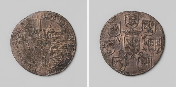 Editor: Here we have an object that feels more like a portal to the past than something displayed in a gallery: a bronze counting medal from 1603. It commemorates the long Siege of Ostend and celebrates Archduke Albert and Isabella of Austria. What captures my attention most is its worn texture – as if history has been physically imprinted on its surface. What do you make of this piece? Curator: Ah, a portal indeed! When I gaze upon this medal, I am transported to a time of sieges and sumptuous velvet robes! The work reminds me that victory can be forged in patience – an idea so radical it still catches the wind in my sails today. The engraving celebrates military dominance; it subtly captures Albert and Isabella’s power while glossing over the grim realities of a prolonged conflict. I wonder, how do you read the relationship between power and propaganda in this small disc? Editor: I guess it's interesting how much this little coin tells us, both directly and indirectly, about that period. It’s propaganda as much as it is art, and a snapshot of power dynamics, which makes you question, who was this coin made for, really? Curator: Precisely! Consider the medal's purpose – not just as a commemorative piece, but also as a tool to solidify power. Its circular shape could symbolize unending rule. Can you see the symbolism reinforcing their reign? The message is less about accuracy and more about perception. The beauty of art, even in propaganda, lies in its layered truths, doesn't it? Editor: It really does change my perspective seeing it as a statement about the period in general. It's not just about Albert and Isabella but their influence over those who are holding the coin, physically tying them to their victory. Curator: Yes, history whispers, doesn't it? Next, we need to consider its place within that time to fully hear that story!