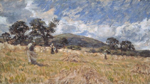 Editor: This oil painting is titled "Vara" by Samuel Mutzner. It gives off such a peaceful feeling, especially with the soft brushstrokes and how the light catches the haystacks in the foreground. What stands out to you most when you look at this piece? Curator: As a historian, I'm particularly interested in the rise of plein-air painting within Impressionism and how that movement reflects shifting societal values. Consider the context: Artists leaving the studio and venturing outdoors coincides with the industrial revolution, the growth of cities, and an increasing nostalgia for rural life. What do you make of that church spire on the horizon? Editor: Oh, wow, I didn't even notice it. It's so faint, but now I see it adds another layer of depth, not just visually but conceptually, contrasting nature with established religion. It almost feels like it questions which holds greater power. Curator: Exactly! These artists, often exhibiting in independent salons outside the established academy, used landscapes not just as pretty pictures, but also to explore modern anxieties about tradition versus progress, urban versus rural, and humanity’s place within nature. Does this add to your initial understanding? Editor: Definitely. Knowing that context enriches my interpretation, making the seemingly simple scene much more complex. Now, when I look at this painting, I see both the tranquility and a subtle commentary on the changing world. Thank you! Curator: My pleasure! It is interesting how even paintings, that seems to have no obvious meaning, tell stories about the periods from which they originated.