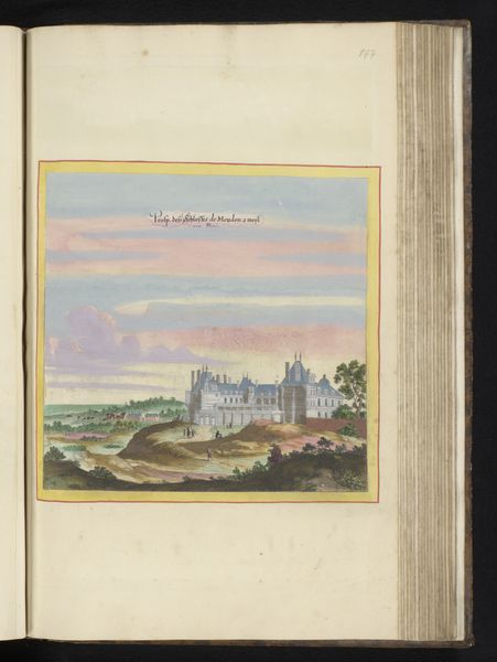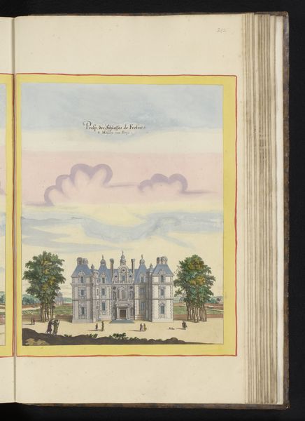Curator: What strikes me immediately is the sheer, almost austere formality. The geometry is so meticulously laid out. Editor: Exactly. We’re looking at "View of Château de Villeroy from the Gardens," dating back to 1655, a work rendered in watercolor and coloured pencil on paper by Matthäus Merian the Younger, currently held at the Rijksmuseum. It captures more than just the building. It also shows its role within a specific social order. Curator: Indeed, and beyond its architectural representation, the rendering exudes the mood of Baroque aristocratic life, which of course, comes with inherent socio-political structures. This image is a document reflecting power, privilege, and perhaps, a certain aloofness from the populace. The château itself looks more like a constructed landscape, and the inhabitants seem quite incidental within it. It certainly asks us to reflect on social divides, and systems of inequity. Editor: Absolutely. Remember the era: landscape painting, especially featuring grand estates, served to legitimize authority. The Château wasn’t simply a residence; it was a symbol of influence, almost functioning as propaganda. The image promoted that very power to others. In whose service does such formal beauty stand? I wonder. It invites inquiry into these representations as constructions of class and dominance. Curator: Also, if we analyze who commissioned this work, and who might have viewed it, we have the possible recipients or stakeholders reinforcing certain ideals regarding class and status that permeate baroque era France. The composition also seems calculated in this regard. Note the sharp perspectival lines guiding the gaze, enforcing a predetermined, almost imposed sense of order. Editor: This wasn’t art for the masses; it visually reinforced existing power structures by celebrating this kind of architectural monumentality and those allowed into this exclusive landscape. Curator: Seeing how the clean watercolor and colored pencil evoke these complex questions about power dynamics underscores how artworks can reflect and influence perceptions. Editor: Absolutely. The way art visually promotes the architecture in question, tells an important historical and sociological story about this cultural period and specific political context.