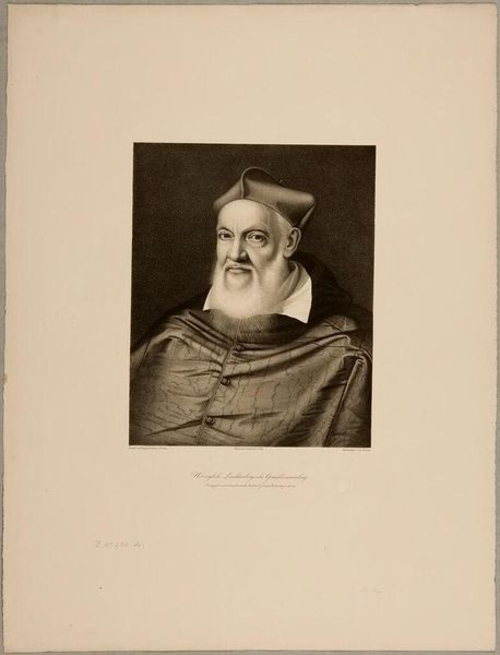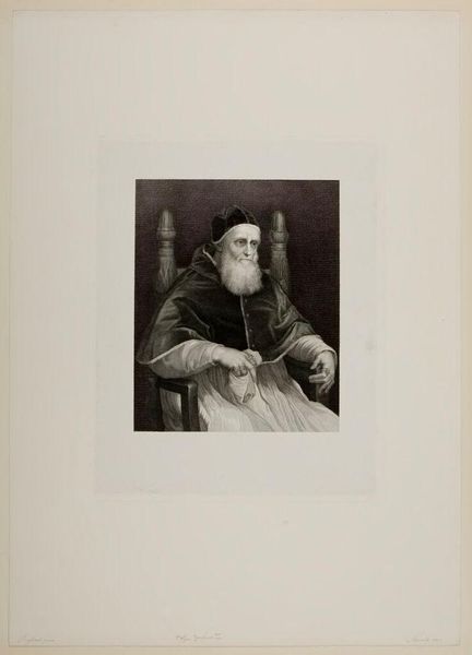 Curator: Here we have Edvard Sonne's "Pave Julius II," created in 1836. It is an engraving, a print rendering of a historical figure. Editor: He seems… heavy. I mean, not in the physical sense, although the bulk of the robes adds to that. But the mood—stern, powerful, maybe a little weary. Look at those eyes! Curator: Indeed. Sonne meticulously uses line and shadow to convey a sense of gravitas appropriate for the pontiff. Note the use of chiaroscuro; the strong contrasts emphasize the folds of his garments and the texture of his beard. Editor: The light almost feels like it’s bearing down on him, concentrating on the weight of responsibility on his shoulders. The ornate chair, instead of projecting regality, feels almost like a cage. He’s trapped in his position, no? Curator: Perhaps. Or it may simply serve as a visual anchor, a formal element to frame the subject and reinforce his authority. Semiotically, the chair represents power. Sonne's understanding of composition really is impressive here. Editor: True, the symbolism of power. But I see the face. All those etched lines around his eyes and mouth. They speak to burdens carried, secrets kept, decisions made, probably tough ones. You know? Maybe that's why I see him less as a ruler and more as… a man. Curator: A compelling interpretation. Sonne does invite multiple readings through his sophisticated rendering of light and form, inviting one to delve beyond the immediately representational. The formal restraint only accentuates the possibility of emotional depths. Editor: So, what started out as a somber portrait actually gave me a moment of thoughtful contemplation about human nature itself. How sneaky and surprising is that? Curator: Art's ability to foster exactly that kind of deeper thought and connection is always what intrigues me.
