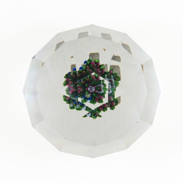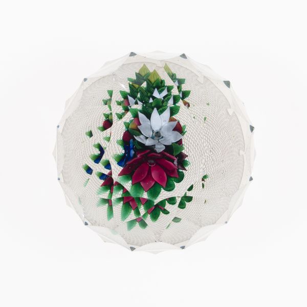 This paperweight was made by the New England Glass Company, sometime between 1818 and 1888. It's an exquisite example of glassmaking, a material that moves between the industrial and the artistic. The process involves trapping delicate, colorful glass flowers and a complex latticino structure within a clear glass dome. This wasn't just about aesthetics; it was about demonstrating extraordinary skill. Glassblowing requires a mastery of heat, timing, and breath control. The embedded floral arrangement and the intricate white filigree show the maker's ability to manipulate molten glass with precision, a dance between control and fluidity. This object reflects the social context of its time, when factories like the New England Glass Company were experimenting with mass production, while still depending on the virtuosity of individual artisans. It challenges our definitions of art and craft, and reminds us that beauty can be found in the ingenuity of the human hand, even within an industrial setting.