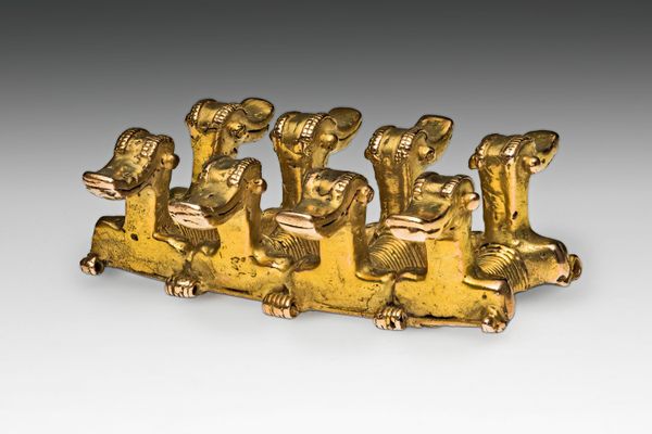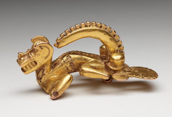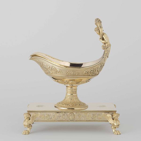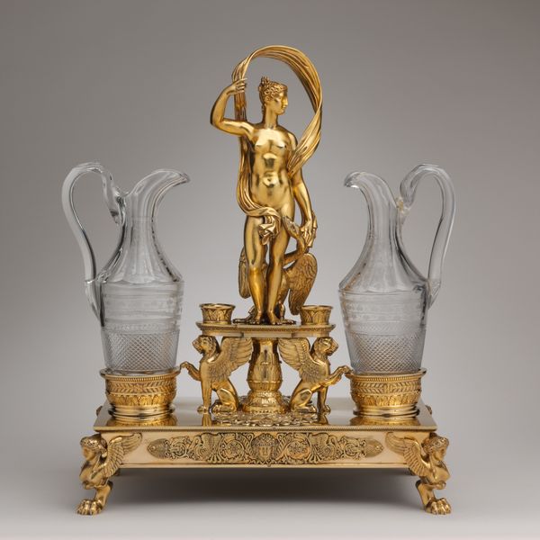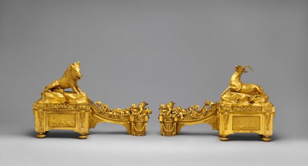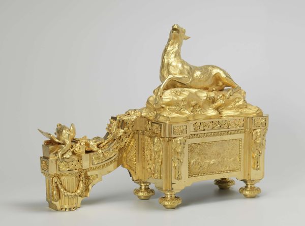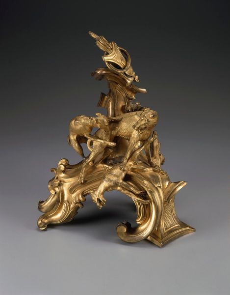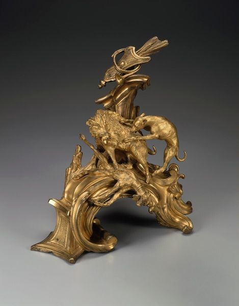Curator: Looking at this opulent instrument, dating from between 1665 and 1675, we're observing what is known as the Harpsichord by Michele Todini. You can currently find it here at the Metropolitan Museum of Art. Editor: What first hits me is its incredible theatricality. The whole thing feels like a scene from an opera, all swirling figures and golden light. Almost cartoonish, with such a shiny finish that distracts from the details in a good way. Curator: Absolutely. The Baroque style, you know, loved that sense of drama. This harpsichord is as much a sculpture as it is a musical instrument, adorned with gold and metalwork depicting what seem like figures from mythology. Editor: The human forms really play with your mind. There are mermen supporting what I can only presume to be the keyboard. The instrument appears to hover in a netherworld as if levitating from its place near the rocky ground. There is a playful contrast here in supporting a keyboard with human and amphibian muscular supports and the almost playful cartoon figures perched on nearby dark, ominous mounds. Curator: Right, note how the artist also plays with allegorical elements? It's not just about showing skill, it's about embedding meaning. Consider how music was often used as a metaphor during the Baroque period – for the harmony of the cosmos, or even the passions of the human soul. Editor: I imagine the piece wanting to create an awe effect to the point of sensory overload. Todini's piece creates this artificial paradise, like some aquatic reverie cast entirely in gold. Its details call into question what part of it has to do with making music and what part of it has to do with inspiring its player. The effect is almost claustrophobic in feeling because you feel like you're supposed to study its entire surface at once. Curator: You nailed it; there is the harmony between music and design on display. I hope people get a chance to truly appreciate its grandeur, the ambition behind it is so admirable. Editor: For me, it's this constant sense of playful contradiction, highbrow meets lowbrow. And also this wonderful over-the-top celebration of excess that feels as extravagant today as I'm sure it did back then.