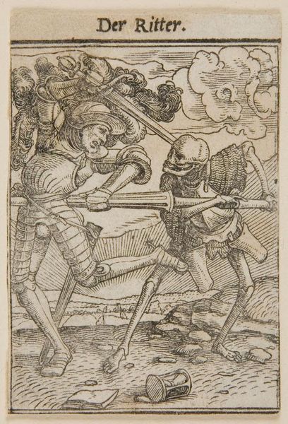 Wenceslaus Hollar created this print, "Waggoner," a Dance of Death allegory, using etching. The composition, dominated by a chaotic pile-up of barrels, wheels, and figures, immediately conveys disorder and instability. Hollar's use of line is intricate, creating textures that emphasize the grim subject matter. Notice how the skeletal figure driving the wagon introduces a stark contrast between the macabre and the mundane. The wagon itself, a symbol of transport and trade, is now a vehicle of death. The semiotic weight of these images underscores a deeper commentary on mortality. The detailed linework and the careful rendering of textures speak to the transience of life. In the context of Hollar's time, marked by widespread conflict and disease, such imagery served as a potent reminder of life's fragility. The overall effect is a destabilization of the viewer’s expectations, prompting a reflection on the precariousness of human existence. The scene, framed by a landscape that offers no solace, reinforces the theme of inescapable mortality.