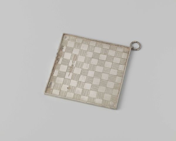 This is a silver games board with pieces, created by Frederik van (II) Strant in the 18th century. At just over five centimeters square, the object presents a fascinating study in miniature and material. The silvery checkerboard is formally divided into a grid of alternating squares, a binary system that speaks to larger philosophical frameworks of order and structure. The cool, metallic texture offers a tactile contrast to the intricate detailing within each square, destabilizing the very notion of uniformity it initially suggests. Light plays across the surface, highlighting the delicate craftsmanship and transforming the board from a mere playing field into a dynamic, reflective object. The pieces themselves, arranged in anticipation of a game, further complicate this interplay of order and chance. In essence, the games board is not just an object of leisure but a microcosm of the tensions between structure and agency, control and unpredictability. Its compact size belies the complex interplay of visual elements, prompting us to consider how even the most familiar forms can invite deeper contemplation.