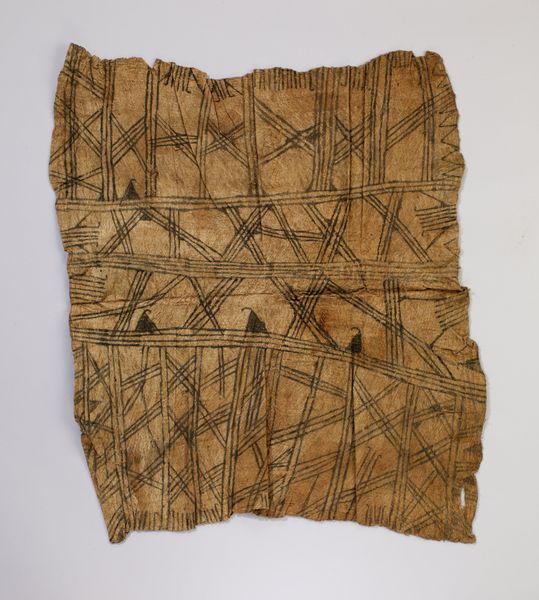 Curator: This piece feels immediately grounding, almost like staring at parched earth longing for rain. Editor: You're picking up on something vital. What we have here is a barkcloth panel created by the Mbuti people around the mid-20th century. It's part of the collection here at the Minneapolis Institute of Art. Pigment on tree bark—quite primal, wouldn’t you say? Curator: Primal is perfect. And it strikes me as intensely personal. The way the geometric shapes repeat—the squares bisected by those sharp lines—it's rhythmic. Are these patterns specific to the Mbuti? Editor: Absolutely. Barkcloth production and the geometric designs applied to it are integral to Mbuti culture. Traditionally, the women are responsible for decorating the barkcloth, and these aren't just decorative patterns; they carry layers of meaning. Some scholars suggest that certain designs can reference elements of their rainforest environment, perhaps a specific path or the layout of a hunting net. Curator: That’s wild. So it’s like a coded language hidden in plain sight. I'm suddenly seeing maps, journeys. Is the imperfection part of its power? You know, how it isn't a perfectly uniform textile. The barkcloth is a reminder of the touch, of hands. Editor: The intentionality in these "imperfections" underscores a fascinating tension between the human and natural world that the Mbuti skillfully negotiate. By transforming this raw material—bark—through techniques of painting and design, the patterns likely resonated deeply, connecting individuals both to nature and to their place within their own society. Curator: I love how something so ostensibly simple speaks to such vastness. Now, when I look, I feel the breath of the rainforest and hear the whispers of a whole community. It’s incredible how the smallest gestures, rendered with devotion, bloom into such meaning. Editor: Yes, this piece really underscores how artistic traditions create connections – linking individuals, the community and their ecological environment, even over distances of time and space. The life in these patterns remains.