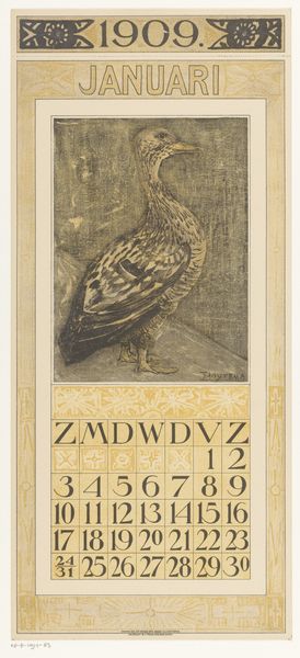 Curator: Here we have Theo van Hoytema’s “Kalenderblad mei met kievit,” or "Calendar Sheet May with Lapwing," created in 1907. Editor: It’s striking! The stylized bird seems to float against the pale wash of background, both elegant and a little melancholic. Curator: The artwork’s structure presents a fascinating interplay between naturalism and abstraction. Note how Hoytema reduces the lapwing's form to its essential elements while maintaining a recognizable representation. The use of watercolor gives the piece a luminous quality. Editor: Absolutely, and the lapwing itself holds a wealth of symbolism, doesn’t it? In Dutch culture, these birds are often associated with springtime and the awakening of nature. It's fitting for a May calendar page. Notice how the repetition of the bird as ornamentation in the top register gives this symbol primacy. Curator: Indeed. Moreover, consider the formal composition. The bird dominates the upper two-thirds, drawing our eye upward, while the calendar grid anchors the composition and establishes a clear geometrical structure below. The interplay between the organic shape of the lapwing and the grid below gives the image dynamism. Editor: That dynamism reminds me of a delicate balance. The lapwing is this beacon of hope, but its form feels tentative as if overshadowed by an inevitable march forward—like how fleeting spring weather always gives way to summer heat. There's a tinge of foreboding. Curator: That interpretation aligns well with the prevailing themes within the Art Nouveau movement, blending the decorative and representational, while simultaneously challenging established hierarchies. This is evident in the way the artist uses line and colour to suggest rather than to define completely. Editor: Yes, the lack of definitive outline lends the composition some movement—fitting for the avian figure. Overall, this is more than just a calendar page. It's a meditation on time, nature, and cultural memory. Curator: Precisely. A fascinating confluence of form and symbol, ripe for continued discussion and debate. Editor: I agree, its formal elegance offers depth with a second look.