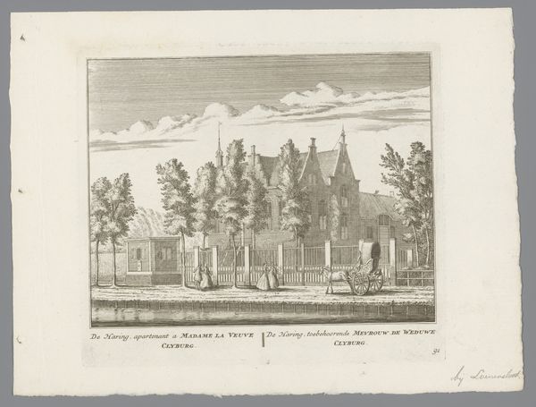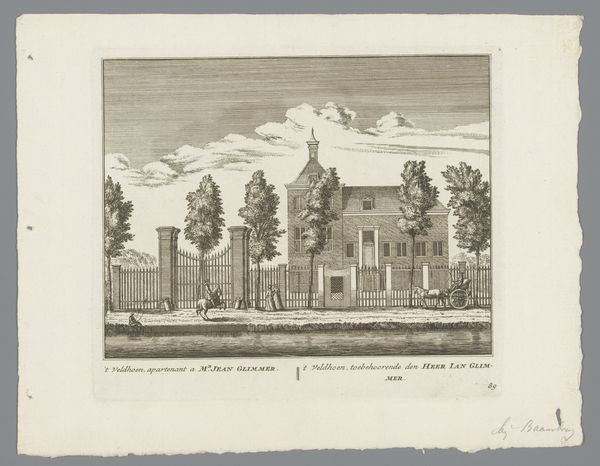Curator: Here we have an etching by Abraham Rademaker, made around 1730, called "Gezicht op de buitenplaats Overdorp, in Baambrugge"—a view of the Overdorp estate in Baambrugge. It resides in the Rijksmuseum collection. Editor: It's a quaint, almost serene scene. The level of detail, given it’s an etching, is quite remarkable. There's something both charming and a bit rigid about the composition; I almost get the feeling of looking at a stage set. Curator: Exactly. The image shows Overdorp, and what’s interesting to note is its context. Etchings like these served as a kind of property survey. The owners, the Klerck family, had it documented, likely for prestige. Think of it as a 18th-century status symbol of land ownership. Editor: That's a valuable point, given the political landscape of the time and how the power dynamics were mapped over the ownership and access to lands and resources. Curator: Certainly. You can see this country estate represented in meticulous detail. The clean lines, the order of the composition; the landscaping, which signifies control over nature itself. Notice the people in the composition almost fade into the background – mere elements within the orderly structure of the estate. Editor: They do seem secondary, almost as decoration to emphasize the opulence. Is there more that this etching, and other similar artworks from that time, tell us about labor or how the local communities fit within this picture? What were the working conditions, their freedoms…? Curator: Unfortunately, these particular visual materials tell us very little about that directly. Land ownership was a source of status and economic prosperity, and this imagery was often deployed to assert one’s rights. The narrative of working people and communities requires significant interpretation and sourcing from parallel archival materials. Editor: So while it presents this air of calm and order, it obscures a much more complex narrative. A visualization of power, rendered carefully as a piece of promotional material, almost. Curator: In a way, yes. Rademaker's etching gives us an intimate window into the world of the Dutch elite. Editor: It is important for the audiences to develop an eye to “read” those windows through intersectional views of class, gender, race… Curator: Precisely! It prompts questions about access and privilege. A good way of critically examining our past through the lens of art. Editor: Yes, by exploring the multi-layered stories behind artworks, we enhance our understanding of how identity and social roles were constructed and maintained in past societies.