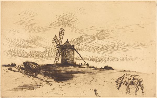 Johan Thomas Lundbye made this watercolor drawing of a post mill near Kalundborg. Lundbye’s choice of watercolor is interesting. It's a medium closely aligned with observation, and capturing fleeting effects of light. Yet, it also allows for a detailed depiction of the mill's construction. Notice the way he renders the wood grain, the careful rendering of the mortise and tenon joints that hold the structure together. The post mill itself is a testament to human ingenuity and labor. These mills were crucial to local economies, grinding grain into flour, but also involved a lot of manual work. In this context, the post mill represents a direct engagement with nature, harnessing wind power to transform raw materials. Lundbye seems to suggest an intimate, almost reverential, relationship between the people, the landscape, and the technology they use. In the end, it is by looking closely at the materials represented, and imagining the processes that produced both the mill and the drawing, that we arrive at a fuller appreciation.