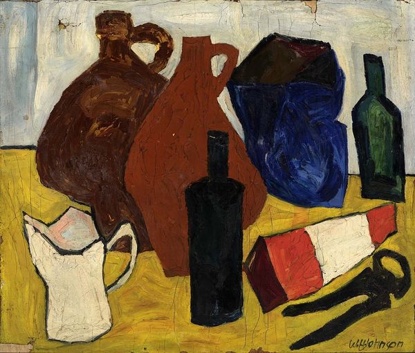 Editor: We're looking at Harald Giersing's "Still Life with Bottle," painted in 1923. It's an oil painting with these muted, almost melancholic grays and browns. There's a real sparseness to the composition, it feels… unfinished, almost? What do you see in it? Curator: Unfinished, perhaps like a thought left lingering on the palate. For me, Giersing isn't just arranging objects; he's distilling their essence. Look how the bottles seem to almost dissolve into the background, they are there but also on the verge of disappearing! It’s less about precise representation and more about capturing a feeling, an echo of those objects. What emotions does that evoke? Editor: A bit unsettling, to be honest. Like a memory fading. So, it's Expressionist then? It feels less about the bottles themselves and more about the *idea* of a bottle. Curator: Precisely. It is pure visual poetry! This is Giersing flexing his Expressionist muscles, taking cues from the Modernist movement. But also adding his personal slant, it seems that the artist has a penchant for making ordinary items special and filled with sentiment, what do you think about the colours, have they affected how you look at the painting? Editor: Absolutely! The somber palette definitely contributes to that feeling. If he had used brighter colours, it could be a completely different story. It's almost…deceptive, how much emotion he can wring out of such a simple setup. Curator: I love the way you called it "deceptive." You could sit with this artwork for hours. It slowly, slyly seeps into your consciousness. Its muted tones might appear quiet but really scream for attention! Thank you, you've given me a new set of lenses with which to view this piece! Editor: Me too! I originally thought it was gloomy, but it is simply being mysterious.