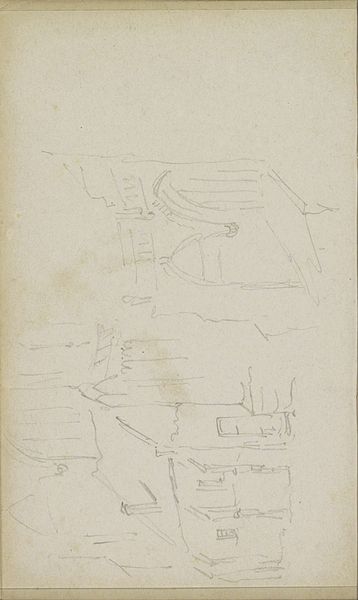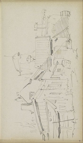 Curator: This drawing, aptly titled "Stadsgezicht," or "Cityscape," is by Adrianus Eversen and dates sometime between 1828 and 1897. It's rendered in pencil on paper. Editor: My first thought is “fragmentary.” It feels like a fleeting impression, a momentary capture of something more substantial. Curator: That impression of transience resonates given the nature of drawings, particularly sketches. They're often preliminary explorations, existing in the liminal space between idea and finished work. Eversen likely created this to refine compositional elements for eventual paintings. The quick pencil work also reveals a direct link to the artist’s hand and process. Editor: I see a strong sense of verticality in the composition, created by those buildings that dominate the space. Despite the sketch-like quality, there’s a clear effort to render architectural forms and light playing across their surfaces, using variations in line weight and hatching. The interplay of light and shadow brings depth to what might otherwise be just linear marks. Curator: I agree, and looking closer we can discern details of everyday life in 19th century Netherlands—details of construction, materials used for the buildings and how those details impact the city as a workspace and living area for local workers. Editor: It also creates a pleasing, even sophisticated, structure. Note how the sketch emphasizes planar recession and perspectival accuracy; that diagonal rooftop, the carefully drawn horizontals in the taller buildings in the middle... all creating spatial depth. Curator: Indeed, the very materiality of the sketch brings forth questions about the labor and means necessary for making such drawings, inviting reflections on the nature of the cityscape and its relationship to broader socio-economic structures. Also, the support which is paper in this work and the production that’s involved invites viewers to imagine a world, era or region in which paper and pencil became popular methods of mass media documentation and record keeping. Editor: I appreciate how we both saw very different but complementary perspectives. Considering this piece as a unified construction with form and social commentary. I notice new connections when viewed together, such as how light bounces on different planes depending on its material. Curator: For me, considering those planes, whether made of plaster or paper, is to consider the value and implications behind the act of artistic creation. What stories of making art with accessible, cheap materials may also reflect on our own art consumption habits today?