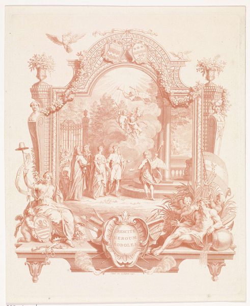 Editor: This engraving from 1874, celebrating the Rotterdamse Schouwburg's centenary, presents portraits and architectural scenes. It feels very commemorative, like a visual history. What do you see in this piece? Curator: It’s fascinating how they've woven together portraits with architectural renderings. Consider the portraits, encircled by laurel wreaths – traditionally symbols of victory or immortality. They evoke the lasting impact individuals can have on a city’s cultural life. Do you recognize anyone? Editor: I don't recognize the figures, but the building facades at the bottom are quite striking. They seem to illustrate the theater at different stages of its existence. Curator: Precisely. And notice the inclusion of the coat of arms at the top, flanked by lions. It speaks to civic pride and a sense of established legacy. But then, we have this strange masked figure amidst musical instruments and honeybees at the bottom - how do you interpret that? Editor: It seems a bit out of place, but the inscription refers to bees extracting essence from flowers, implying that Rotte and Maas extract "Nut, Vermaak en Leering" - utility, amusement, and learning - from culture. So perhaps the theater distills cultural knowledge. Curator: A vivid analogy! And look closer; even that curious mask echoes theatrical traditions. These symbols aren't arbitrary but resonate deeply within a shared cultural memory. It prompts us to question how public spaces reflect and shape collective identity. Editor: It's amazing to realize the density of symbolic layers packed into what at first seems just like a historical record. Curator: Exactly. This work isn't merely documenting history; it's actively shaping how we remember it through symbolic language.