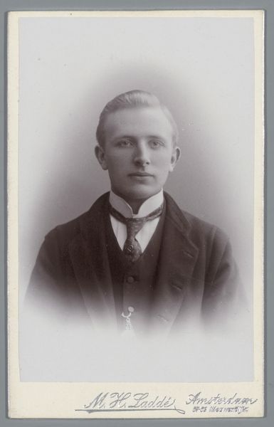 This reproduction of a photograph, painting, drawing or print, now held at the Rijksmuseum, presents a study in tonal contrasts. Shades of gray articulate the figure of a man against a subtly clouded backdrop. The artist, despite being unnamed, demonstrates a keen awareness of form through varying densities of light and shadow. The composition is elegantly simple. The subject, dressed in a dark coat and light cap, is positioned centrally, his pose casual yet deliberate. The hands are tucked into his pockets, the line of his coat creating strong vertical forms, which are softened by the slight tilt of his head. This portrait destabilizes conventional portraiture through its starkness. Absent are the markers of status or personality. The artist encourages us to consider the interplay between form and representation. Ultimately, the power of this image lies in its formal austerity. It invites us to look beyond the subject to appreciate the artist’s mindful arrangement of tone, line, and mass, challenging our preconceptions about identity and representation.
