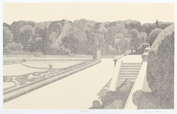 Editor: Here we have Eric Ravilious’ "Leaving Scapa Flow," created in 1940, using mixed media of drawing and printmaking. I find the muted colors create quite a somber mood. The geometric shapes of the ship contrast sharply with the rolling hills in the distance. What stands out to you in terms of its formal qualities? Curator: What I note is how the composition guides our eye. Consider how Ravilious establishes a clear foreground, middle ground, and background, layering space through shapes and their organization, particularly noting the contrasts. The eye moves across planes to shapes representing landscape and water; he utilizes line work effectively, don’t you think? Editor: Definitely. The lines give a texture, almost like waves rippling, yet they're just marks on a page. And the limited palette - various shades of grey with muted greens and browns - seems intentional, lending a certain austerity. Is it correct to interpret Ravilious emphasizing structure over vibrant hues in a landscape scene such as this? Curator: Precisely. This piece favors structure over vibrancy and it does so purposefully. By flattening forms and simplifying shapes, attention shifts from pure representation to construction, and more towards design and the spatial dynamics the artist constructs within the composition itself. Observe the interplay between flat planes and subtly rendered three-dimensional forms, which evokes a dynamic, yet strangely static scene. Editor: It’s interesting how focusing on structure and composition reveals so much. I initially responded to the mood, but analyzing the forms gives me a deeper understanding of *how* that mood is achieved. Curator: Absolutely, and remember to view not just the artwork but also the thought processes in which the artist utilized those choices as you consider your individual perspectives. Editor: Thanks so much! It definitely highlights how every formal element plays a critical role in shaping the viewer's experience.