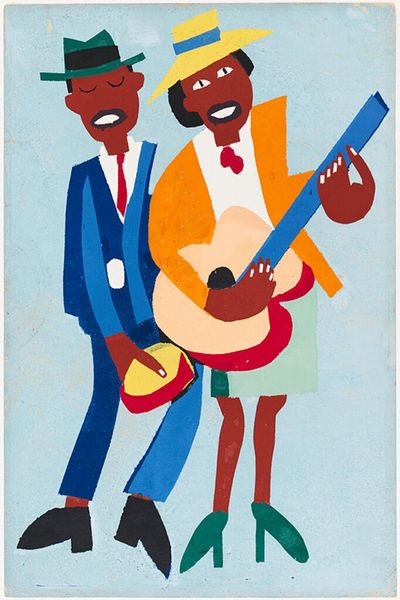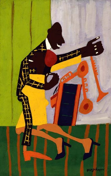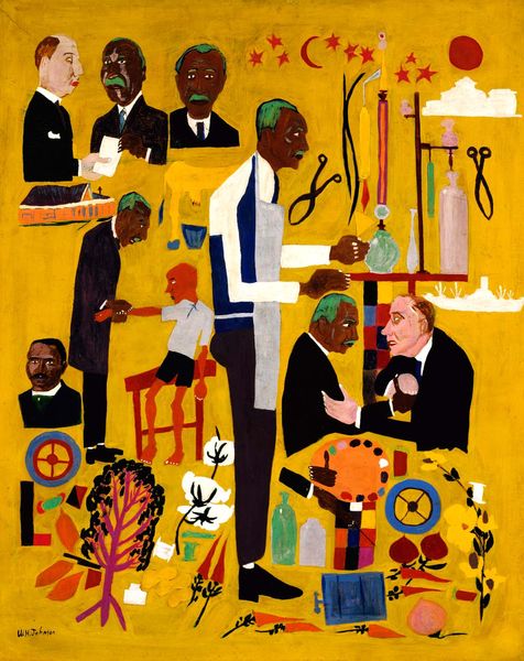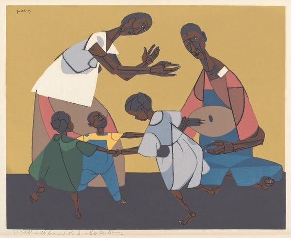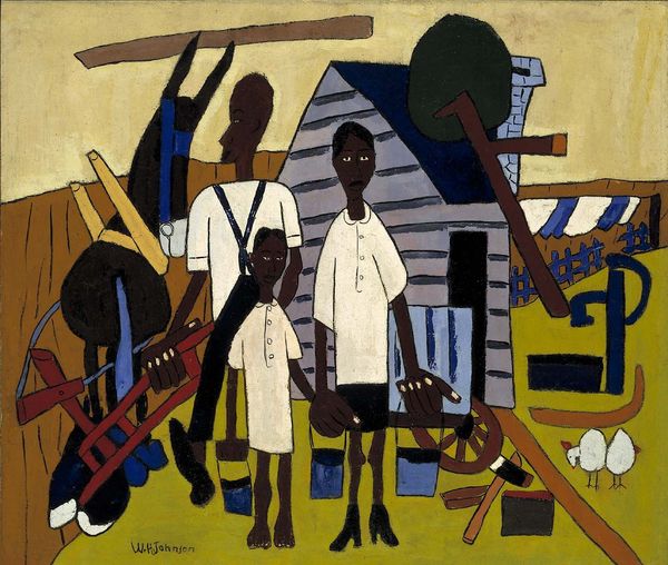 Editor: We're looking at William H. Johnson's "Farm Family - Nursing Child" from 1944. It appears to be oil paint on canvas. I’m immediately struck by its folk-art aesthetic; it’s both simple and quite powerful. What draws your eye when you look at this piece? Curator: The simplification of form and bold color choices highlight Johnson’s concern with materiality and production. Look at the roughness of the paint application, the almost crude rendering of the figures. It isn’t about illusionism, it's about the stuff of painting itself and the labor embedded in it. How do you see the composition reinforcing that idea? Editor: I guess the lack of depth contributes? It flattens the image, emphasizing the surface of the canvas and the materiality you mentioned. I was focusing on the figures themselves, on the intimacy of the nursing mother... Curator: Right, but even the intimate act of nursing isn't romanticized. The blunt shapes, the unidealized forms—they resist sentimentality. Johnson's more interested in showing the *work* of family, perhaps. The work that happens outside on a farm and in raising and caring for children. Where do you think this perspective originates for Johnson? Editor: Perhaps from his own background? From witnessing the lives of rural communities? Curator: Precisely! Think about Johnson's context during the Harlem Renaissance, and his choice to depict scenes of everyday Black life in the rural South. What statements do you believe the artist may have wanted to suggest in regard to work and class? Editor: It makes me think about how labor and lived experiences of Black families are often overlooked in mainstream art. Showing their work makes it a form of recognition, and validation? I appreciate how this challenges preconceived notions of art and labour. Curator: Indeed. Johnson's focus on material, method, and setting asks us to question the societal constructs around art itself, challenging divisions between the supposedly high art of the canvas and the overlooked labor that sustains lives.