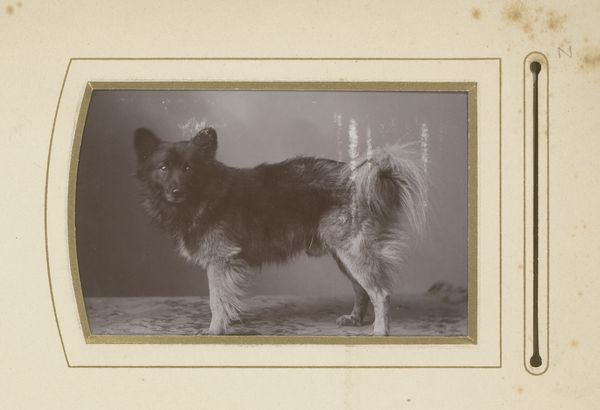 Curator: Allow me to introduce you to a peculiar photographic print attributed to W.G. Kuijer & Zonen, likely captured sometime between 1885 and 1899. The rather straightforward title is “Op tafel zittende hond,” or "Dog Sitting on a Table." Editor: First thought? That dog looks like he's about to give me some seriously judgmental advice. I’m getting a definite "disappointed headmaster" vibe. Curator: Yes, there's an air of sternness about it. Beyond the amusing posture, I find the setting so fascinating. Elevating an animal onto a table—especially in that era—speaks volumes. Dogs often symbolize loyalty, protection, or servitude. Positioning this one on a pedestal, so to speak, disrupts those easy associations. Editor: True! It also makes me wonder about the relationship. Was this pup truly a pampered family member, or just a random shot taken for the novelty of it? I picture the photographer bribing him with treats just to get him to sit still! The blurred tail just shows a little movement during what would have been a long exposure! Curator: Absolutely. We're peering into a past where even seemingly simple images were carefully constructed and imbued with meaning. Notice the detailed ornamentation of the table itself, the decorative border—these elements create a sense of formality, almost demanding respect for the sitter, as it was typical for human portraits of the time. This could imply that the dog held some sort of importance or wealth and standing in the household it was a part of. Editor: That little dog tag adds a sweet, humorous touch too, don’t you think? Like even in 19th century we were labeling our best friends! Curator: Precisely. And let’s not dismiss the enduring allure of such vintage photographs, of still life portraits. Editor: Agreed. It has a melancholic quality that reminds me to not take any photo or the present day for granted, with that almost painterly light and a good pup just hanging out!