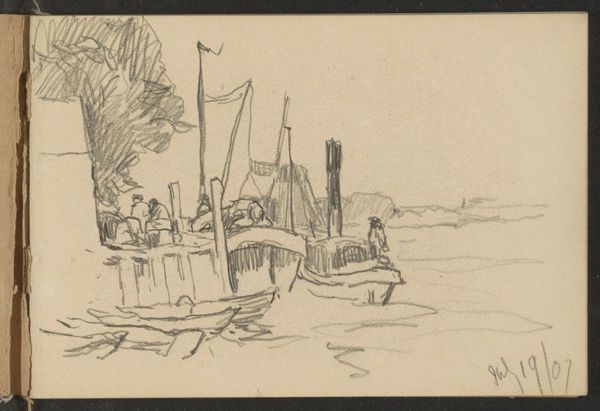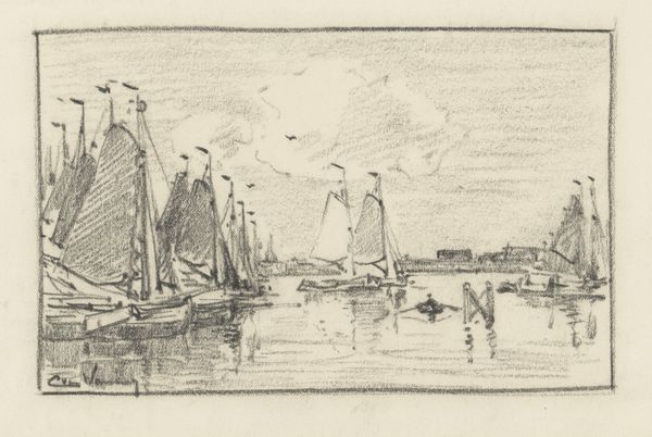 Curator: Before us is "Small Sailboats and a Three-Master," a pencil drawing by Johan Barthold Jongkind. The piece gives us a glimpse into Jongkind’s vision. Editor: My immediate feeling is one of serenity mixed with a touch of melancholy. The limited use of pencil makes it feel quite ephemeral, like a fleeting moment captured from a dream. Curator: It certainly embodies a dreamlike quality. Jongkind, a pivotal figure in the pre-Impressionist movement, often sought to capture the essence of light and atmosphere in his work, anticipating many techniques of the later Impressionists. We can also recognize Dutch maritime power and trade. Editor: Right, that light is beautifully rendered just through line quality. Note how he suggests form and reflection, evoking the symbolism of journeys and transitions. I am reminded of mankind's persistent yet delicate relationship with nature and its impact. Curator: The choice of subject matter places him firmly within a specific art-historical context, linking back to the grand tradition of Dutch maritime painting, yet his rapid sketch-like strokes align him with a modern sensibility. The drawing medium gives him an ability to test out new techniques in anticipation of their deployment within large canvas works. Editor: I like the idea of seeing the sketches as a hint of something greater. Also, water often symbolizes the unconscious, and these boats…they might represent ideas or emotions navigating that vast, internal sea. Curator: Or perhaps we read it too heavily? Maybe it simply reveals how the development of maritime transportation facilitated globalization and changed society. Its importance as a subject could reflect a growing national pride connected with its role in commerce. Editor: It’s compelling to consider the role and importance of art in its various contexts. Curator: Exactly. Viewing art in its broader cultural setting encourages greater social awareness of the importance of image creation and interpretation in different societal eras. Editor: And that’s the beauty of it, isn’t it? How different lenses bring into focus details otherwise unseen.