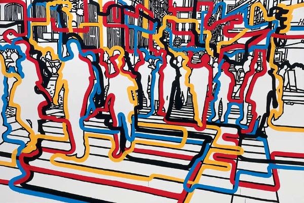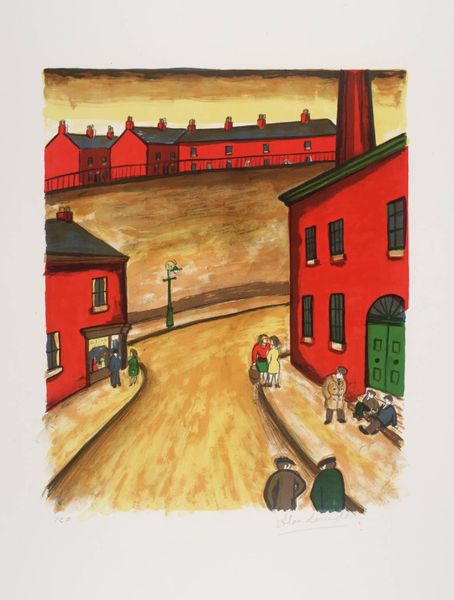 Curator: Hide Kawanishi, born in 1894, created this vibrant woodblock print titled "Street Scene, Motomachi, Kobe." Look at the details! Editor: Wow, it's busy but breezy, you know? A real snapshot of urban life. The bright blue sky peeking between the buildings really lifts the mood. Curator: Notice how Kawanishi uses colour; the red awnings, the yellow bicycle. It almost feels like a visual feast, doesn't it? It definitely captures a sense of place. Editor: Yes! Those colours pop! And all those umbrellas in the crowd, like floating dots of colour. Makes me think of a bustling market, even a little chaotic, but charming. Curator: And the way the buildings lean in, the lines creating depth. It's a powerful reminder of the energy of city life. Editor: It really is, a compressed moment of pure, vibrant experience. I am left yearning for the noise and motion and those colours. Curator: Indeed, a window into another time and place, captured in a single image. Editor: Absolutely, a delightful piece that sings a song of urban joy!