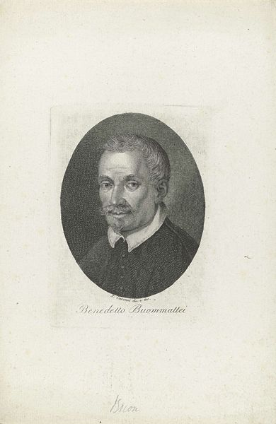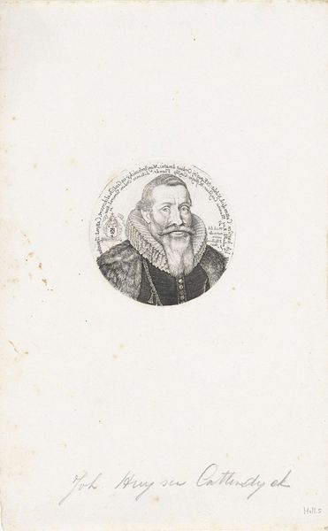 This is Reinier Vinkeles’s portrait of Willem I, Prince of Orange, made with etching. What strikes us immediately is the composition: a circular frame focuses our attention sharply on Willem’s bust. The texture, created through fine, deliberate lines, gives the piece a tactile quality, almost as if the figure is emerging from the paper itself. This detailed treatment contrasts starkly with the undifferentiated background, making the portrait feel both immediate and timeless. Vinkeles's use of line isn't merely descriptive; it constructs form, and evokes character. The controlled strokes around the face capture the Prince’s dignity, while the broader, heavier lines defining his armor suggest strength and resolve. The circular frame not only isolates but also elevates Willem, transforming a political figure into an almost iconic presence. It’s a calculated effect, positioning the Prince within a semiotic system of power, remembrance, and perhaps even veneration. This is not just a portrait; it's a carefully constructed symbol designed to communicate and endure.