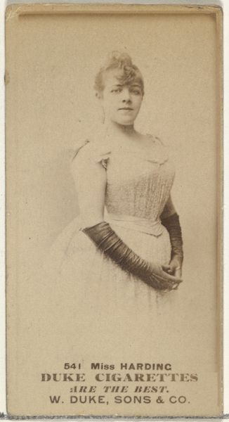 Editor: So, this is "Mlle. Cadwell," a print from around 1885-1891 by Allen & Ginter, part of an "Actors and Actresses" series made for Virginia Brights Cigarettes. It's fascinating to see photography used this way. What stands out to you when you look at it? Curator: Immediately, the cigarette advertisement strikes me. The mass production of these cards for promotional purposes democratizes art but simultaneously commodifies it. This blurring of high art and commercial enterprise is very telling of the period. How does it sit with you that this portrait's primary function was to sell cigarettes? Editor: I never really thought about that side of it. Does the means of production affect the status of the art itself? Curator: Absolutely. The shift from handcrafted portraits to mass-produced images impacts our perception of value and authenticity. Consider the materials: a simple card, easily reproduced. This isn't about unique artistry in the traditional sense; it’s about marketing and distribution, reflecting a rapidly industrializing society and growing consumerism. Editor: So, it's less about the artistic skill and more about how it functions within the economy? Curator: Precisely! The labor involved in producing and distributing these cards, the economic structures that enabled their creation, and the way they were consumed – these are central to understanding the work's significance. Think about the tobacco industry at the time. What does it mean to represent this actress promoting this industry? Editor: It definitely provides a fresh perspective, understanding art not just as an aesthetic object but as a product of its time and circumstances. Curator: Exactly. Focusing on materiality and consumption reshapes our understanding of art history, inviting critical discussions.