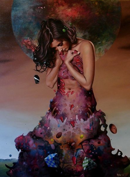 Curator: Dragan Ilić Di Vogo’s 2013 painting, “Universal Field,” really captures a dreamy sensibility, don’t you think? Editor: Absolutely. There’s something unsettling about it though, in a compelling way. The texture of the draped cloth is quite stunning. You can almost feel its weight. And is that oil paint? Curator: It is. There's a fascinating layering of symbolism here. The woman, draped in what appears to be fabric, stands in what might be considered a desolate space, but overhead loom these almost uterine, celestial orbs. I think we are meant to consider the individual within the vast cosmos. Editor: It makes you think about the origins of that material, that cloth... who made it? What were their working conditions? It gives the painting another layer of human experience. Curator: That brings an interesting tension to the dove imagery, normally representative of peace. Do they offer it or challenge the setting's innate loneliness? Even those scattered, tessellated blocks disrupt an easy read. They suggest chaos and ordered systems. Editor: Those blocks definitely grab attention, acting as both structural oddities and aesthetic decisions. Speaking of decisions, the choice to employ oil on canvas is pretty traditional. Do you think the artist was making a conscious effort to ground the subject, to play against the fantastical elements? Curator: That is interesting, this tension of tradition versus invention. By grounding it in a traditional technique, perhaps Di Vogo invites us to explore our own connection to these universal questions with recognizable familiarity. Editor: Or maybe oil paints were simply the most readily available and affordable means of production for them, leading to a broader range of creative possibilities than, say, a digital print. Curator: It really is evocative. It's difficult to pull away. Editor: Right, thinking about both the symbolic meaning, and the very practical decisions behind its construction and materials—they offer completely different ways to situate this artwork in our understanding of the world.