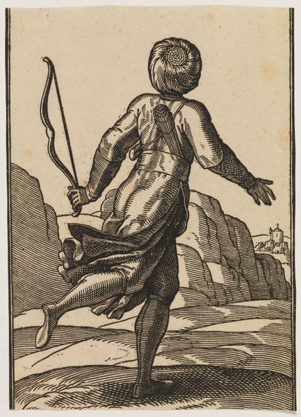 Editor: Here we have a 1576 woodcut by Melchior Lorck titled "Soldat, g\u00e5ende mod h.; st\u00f8vler og kn\u00e6kort dragt; i v. h\u00e5nd en bue, i h. h\u00e5nd en pil" - or "Soldier walking to the right". There's a slightly unsettling feeling to this piece, almost like a dark fairytale illustration. What catches your eye? Curator: It’s Lorck, alright! His work always has this compelling awkwardness, doesn't it? He clearly had an eye for the unusual. Here, it's the sheer humanity that bursts forth—look at the detail etched into the face! Does this man strike you as a hero? I think not, and yet there’s a grounded determination. The Northern Renaissance loved detail, of course. But it’s more than that, wouldn’t you agree? Editor: Absolutely, the facial expression really humanizes him. And no, not hero material! What is the significance of the bow and arrow? Is he a hunter? Curator: Possibly! Consider the broader context. This work emerges from a time of intense cultural exchange, where artists travelled widely and acted like cultural spies, recording their impressions, even sometimes with prejudice. Also, did hunters ever have such fashionable footwear?! In this case, I find that Lorck doesn’t just depict but seems to want to capture a feeling, an atmosphere. What feelings does it evoke in you, if you don't mind my asking? Editor: It evokes curiosity and a sense of quiet intensity. There’s a lot more depth than I initially thought. I’m intrigued by the details. Curator: Wonderful! That’s the magic of a Melchior Lorck piece! Each line, each deliberate shadow seems to whisper a secret, if you listen closely, maybe about to reveal something, anything, from an exotic traveler to a local, that once crossed his path, and ours as well!