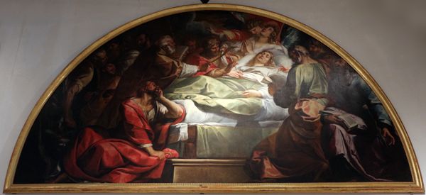 Editor: So, this is Théodore Chassériau's "The Descent from the Cross," painted in 1855, an oil mural. The somber colors and the figures clustered around the body evoke a strong sense of grief. What do you see as the key elements of this composition? Curator: Primarily, I am drawn to the orchestration of color and form. Note the arrangement of the figures – their postures and the folds of their garments. The artist utilizes a restricted palette to enhance the emotional gravity. Observe, too, how the curve of the painting's surface influences your viewing experience; it serves to almost enclose the viewer, inviting introspection. Editor: That's a good point. I didn't consciously notice that the form echoed the mood. But what about the way the figures are rendered? They seem quite idealized, almost theatrical. Curator: Precisely. Consider the inherent tension between the realism demanded by the subject and the ideal forms Chassériau employs. Is it a paradox, or is it through that stylization that he amplifies the event's significance? Think of how the precise anatomical depiction works with, or perhaps against, the clear emotional intent. The calculated arrangement is central to interpreting meaning. Editor: I guess it does elevate it beyond a simple historical record. Curator: Indeed. And, the considered balance within the composition—the light and shadow, the figure groupings—it all works to create a harmonious whole, albeit a mournful one. A unity born from structured grief, wouldn’t you say? Editor: It certainly offers a lot more depth to unpack when viewed through that formal lens. Thank you! Curator: My pleasure. Thinking structurally certainly enhances my understanding as well.