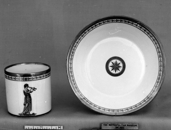 Editor: We’re looking at a porcelain saucer, part of a coffee service, made by the Nymphenburg Porcelain Manufactory between 1800 and 1815. What strikes me is the stark contrast between the detailed Neoclassical imagery on the cup, versus the more abstract, geometric pattern of the saucer. What stands out to you? Curator: The structure is quite compelling. Observe the concentric rings on the saucer; each contributing to a defined visual plane, and anchoring the eye at the centre. Then consider how this interplay complements the cylinder form. Note how the band of ornamentation and the silver trim provides an almost grounding horizontality to the composition. Editor: I hadn't considered the interplay of the forms. It feels like there’s a dialogue happening just between the shapes and the lines. Curator: Precisely. And consider the implications of its production – the flawless white of the porcelain body serves as a blank canvas. An abstract field punctuated by controlled graphic interventions, it almost reads as a reduction to primary signifiers, where beauty becomes pure sign. What impact might this simplification have on the coffee ritual itself? Editor: That's fascinating to think about, especially considering it's part of a coffee set. So the visual design directly interacts with a daily habit. I'm looking at this in a new light. Curator: It is in this delicate choreography of function and aesthetics that one can start appreciating the underlying artistic framework. Notice how function does not dictate the terms of decoration; form precedes experience. Editor: I see how this approach emphasizes visual construction, revealing meaning in its purest form, so to speak. Thanks. Curator: My pleasure. I hope this exploration of materiality and form serves you well in your future endeavours.