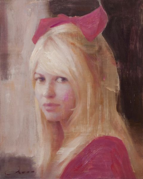Editor: So, this is "Portrait of a Virgin" by Rose Freymuth-Frazier, painted in 2012. It looks like an oil painting. There's something about the way she's painted that feels very classic, but her expression is very contemporary. How do you interpret this work? Curator: The title immediately frames the painting in relation to centuries of art history and religious iconography, but with a pointedly contemporary approach. Consider how the concept of "virginity" has been historically constructed and used to control female identity and sexuality. What happens when that symbolic power is transferred to a distinctly modern face? Editor: It's interesting that you mention control. The model's face feels both innocent and challenging at the same time. Curator: Exactly. And that's where the contemporary twist becomes powerful. Think about the artist deliberately playing with traditional themes of purity and innocence. Does this image reinforce those old stereotypes, or is it subverting them? What does her gaze communicate to you? Editor: It feels knowing. Like she's aware of how she's being perceived, but is also choosing to present herself this way. The flowers in her hair… is that another Virgin Mary reference? Curator: Absolutely. The flowers, the soft color palette - they all point towards familiar, idealized representations of femininity, maybe even innocence. Yet, the directness of her gaze unsettles those associations. This challenges the viewer to reconsider those representations. How do you think the artist uses these familiar symbols? Editor: I see. So it is not just a portrait, but a statement on how women have been portrayed and perceived throughout history. This artwork certainly gave me a lot to consider! Curator: Precisely, and by engaging with art, we enrich our understanding of historical power dynamics in visual culture.