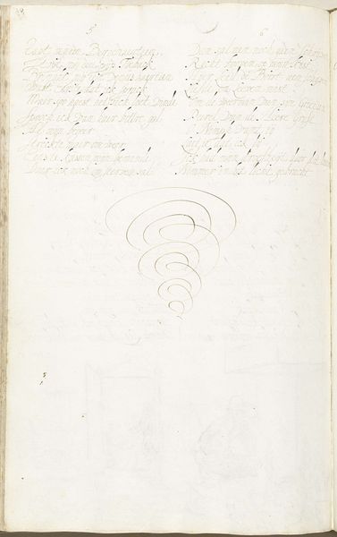 Curator: Here we have “Religieus gedicht,” or “Religious Poem,” a drawing in pen and ink on paper by Gesina ter Borch, dating from approximately 1657 to 1659. It's currently held in the Rijksmuseum collection. Editor: The effect is rather striking. The pale paper, almost translucent, overlaid with this precise, dark script—it creates a hushed, intimate atmosphere, as though we're peering into someone's private thoughts. Curator: Absolutely. Ter Borch's calligraphic style resonates with that medieval quality and offers an insight into her spiritual contemplations. We have both the handwritten text, likely a personal poem, and an unusual swirl motif at the bottom. It calls to mind cyclical time. Editor: I’m captivated by that swirl. The controlled, rhythmic descent of the lines seems almost like a visual representation of the text finding its grounding, coming into material being on the page. There's a distinct sense of form mirroring content. Curator: Ter Borch was unmarried, and this manuscript is just one facet of her introspective explorations. Her delicate rendering hints at themes of mortality and the search for divine connection, particularly within a 17th-century Protestant context, emphasizing direct communion with God rather than intermediaries. Editor: And yet, within those deeply personal expressions, the careful arrangement, the balance of text and the vortex image below, reveal a keen awareness of aesthetic principles and structure. Even spiritual searching relies on fundamental compositional forms. Curator: Ultimately, viewing this “Religious Poem” offers a unique encounter with a woman's devotional life rendered with technical mastery, preserved for our contemplation centuries later. Editor: Yes, it's that quiet blend of inner reflection and meticulous visual craftsmanship that leaves the most lasting impression.