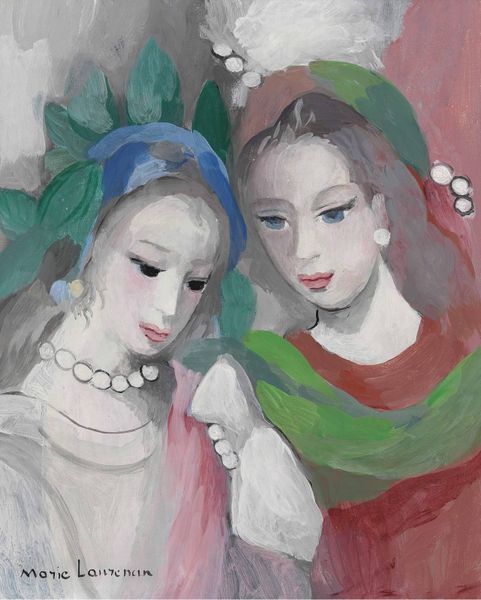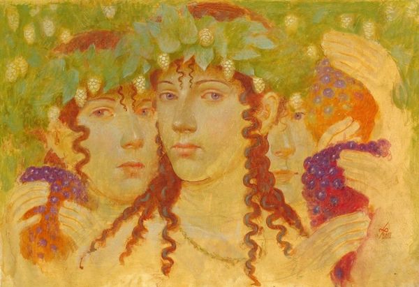 Curator: Stefan Luchian created "Spring (Two Muses)" in 1899. Luchian employed oil paints, demonstrating clear Impressionist and Symbolist leanings. Editor: The painting feels very lush and dreamy, almost decadent. It's the kind of image that suggests hidden meanings. The surface appears heavily worked. Curator: Indeed, observe the brushstrokes. They are applied with a visible texture. The composition has this tension between the flat plane of the canvas and an illusionistic space. Notice how the artist juxtaposes the foreground figures and a very loose background. Editor: Those reds and yellows feel particularly crucial to my understanding of the work. Were these locally sourced pigments? What type of labor went into their production? The choice of colours and materials seems central to its aura. Is Luchian making a statement on beauty or is this painting just pretty to look at? Curator: The high key palette contributes to its vibrancy, certainly. However, it's also interesting to examine how the lines are simplified to convey ideal forms rather than mere appearances. Consider how he uses formal arrangements of shapes and colors to evoke states of emotion rather than descriptive accuracy. Editor: I see what you mean, but to look past the painting’s materiality risks missing part of its historical essence. Where did Luchian learn to create paintings with that surface? Who was his intended audience? Who owned this painting directly after it came off the easel, and how might that original transaction have shaped our interpretations? Curator: Those points are well-taken and remind us about the many layers of meaning possible. Editor: Looking more deeply into this, perhaps Luchian was exploring both aesthetic and socio-economic themes related to female ideals through materials easily found in his own location, which only underscores his contribution to the dialogue between high art and lived realities. Curator: An elegant summary. It really comes down to exploring this interplay of representation and fabrication.