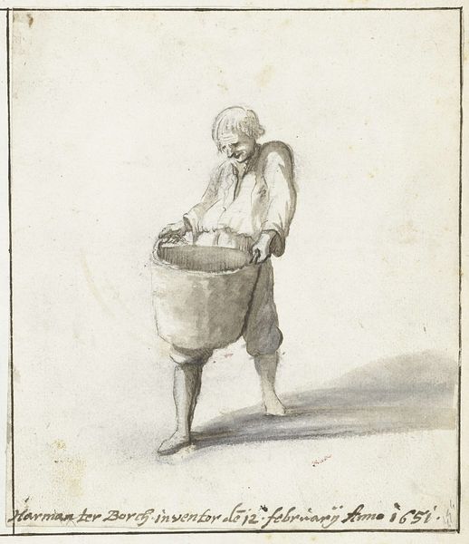 Editor: Here we have Julius Mihalik's watercolor drawing, "Zoar Apple Basket," created around 1938. It's a lovely, realistic rendering of an everyday object. What strikes me is how humble the subject is, yet the detail elevates it. What do you see in this piece, considering its place in art history? Curator: I find this drawing interesting when viewed through the lens of social history. Consider that in 1938, the United States was still emerging from the Great Depression. Art often reflected the values of self-sufficiency and rural life. Do you see how this apple basket can be symbolic of simpler times, an almost nostalgic look at agrarian society? Editor: I hadn’t really thought of it that way. The apple basket becomes more than just a container; it's a symbol of a specific cultural and economic moment. I guess I was viewing it from a purely formal perspective initially, focusing on the craftsmanship. Curator: Precisely. It's easy to appreciate the skill in the watercolor technique, but we can delve deeper by looking at the context in which this art was made and received. Museums, through their curatorial choices, can shape the public's perception and understanding of what constitutes "art" and whose stories are being told. Was this drawing intended for public display or personal enjoyment, and how does that influence our current interpretation? Editor: So, the image’s historical background and original intended use are all vital to how we perceive it. That adds a new layer of richness. Curator: Exactly. By questioning these elements, we can gain a better understanding of art’s public role and its relationship to broader political and social dialogues. Considering who gets represented, how, and why becomes critically important. Editor: It really changes how you appreciate something so simple. Thanks for widening my perspective! Curator: My pleasure. Looking beyond the surface is what truly enriches our experience with art.