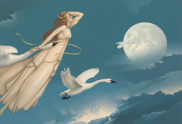 Editor: This is "Ashtaroth" by Boris Vallejo, created in 1993 using acrylics. It's a very dreamlike image. A nude woman reclines on a crescent moon surrounded by a starry sky. What strikes me is how hyperrealistic the figure is set against the more illustrative background. What do you make of this contrast? Curator: This piece really foregrounds the means of production. Look closely at the female figure: Vallejo’s masterful command of acrylic paint transforms her into an idealized, almost hyperreal, object. He's showcasing his technical skill. But what does this say about the role of labor? Think about the painstaking process of layering paint to achieve such smooth skin tones versus the relatively less defined rendering of the background. Editor: So, you're saying the technical execution itself carries meaning? Curator: Precisely. Consider this was made in 1993. What was the prevailing cultural narrative regarding the female body? The image is consumed as much as it’s looked at, packaged and sold as fantasy. Ask yourself: What is she selling? What about the material reality of being a woman versus the commodified image he creates? Editor: I guess the romantic, escapist imagery almost disguises how constructed it is as a product of labour and societal expectations. It feels very removed from real lived experience. Curator: Exactly. The fantasy elements, the celestial setting – these deflect from a deeper engagement with the materials and their implications. He's using Romanticism, maybe even orientalism tropes, to further emphasize the labor, skill and effort involved in crafting this "idealized" vision and distracting viewers from recognizing cultural constructs. Are you surprised? Editor: It's certainly given me a lot to consider about fantasy art and how much craft goes into building a particular vision, maybe more that I first recognized. Thanks for that insight! Curator: And I found our talk fascinating; material analysis exposes so many more assumptions that underpin what we consider "art".