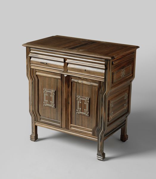 This impressive Kast, made of oak, now resides at the Art Institute of Chicago. Its anonymous maker likely employed a range of woodworking tools and techniques that had been developed over centuries. Notice how the material, oak, greatly influences the appearance of the wardrobe. Its weight and density allow for robust construction, but also demand careful planning in its assembly. The maker would have needed considerable skill to cut, shape, and join the timber, creating flat panels, raised elements and turned feet with decorative detailing. The dark color and grain of the oak add to the Kast’s solemn presence. The wardrobe's construction speaks to a society where woodworking was a valued skill, and furniture making was a significant craft. The Kast represents the combination of functional design and decorative artistry, reflecting a culture that valued both utility and beauty in everyday objects. Considering the labor involved in its creation, it challenges us to appreciate the craftsmanship inherent in this remarkable piece of furniture.