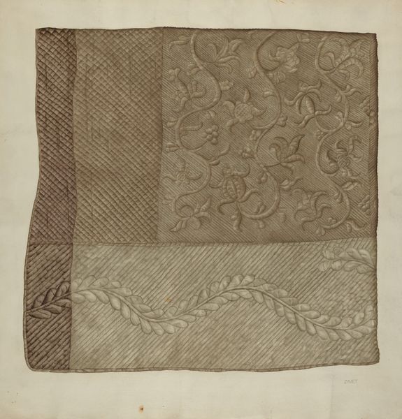 Editor: This is Jean Peszel’s “Lace Cravat,” a pencil drawing done sometime between 1935 and 1942. The intricate detail is really captivating! What symbols or meanings jump out at you in this piece? Curator: The cravat itself is a potent symbol. It speaks of status, aspiration, and self-presentation. The level of detail is quite striking; it suggests an investment in maintaining these cultural signals, but also maybe even satirizing such efforts. It reflects on how external appearances shape perception and identity. Editor: That’s interesting. I hadn’t considered the cravat as such a strong status symbol. Curator: Think about the floral motifs rendered in pencil, in the line work of the lace. They are not naturally posed or realistically depicted, but follow a schematic language from other decorative patterns; each has echoes of a deeper shared symbolism. Does that resonate with you? Editor: Yes, I see what you mean. It’s like the drawing is preserving or maybe reinventing a particular cultural memory linked to the floral designs. What would a contemporary wearer associate it with, if anything? Curator: Possibly with craftsmanship and elegance, but there is a bit of ironic distance built in – the medium being pencil, for one thing, not a precious metal, perhaps offering social critique on the wearer? How we visually present ourselves has always been fraught, psychologically. It’s a sketch of an idea, or a possibility. Not a definitive final expression. Editor: So it invites the viewer to think about all these associations and how they relate to identity and self-expression. Thanks, this has really opened up how I see this drawing! Curator: It's a small window into the vast and layered landscape of how symbols work, and how deeply embedded they are within our everyday understanding. Thank you, likewise.