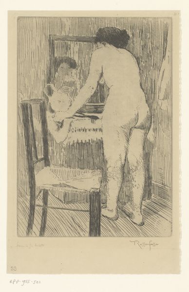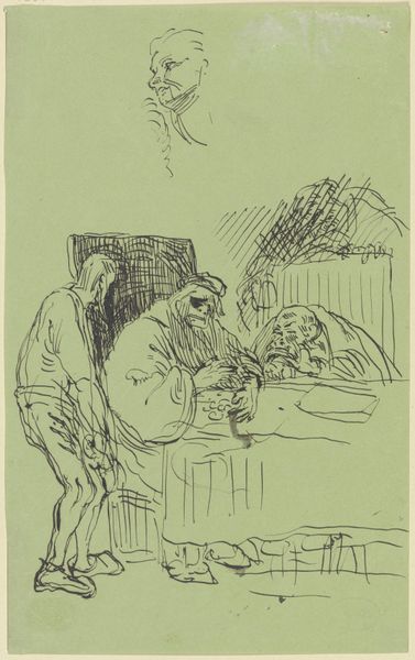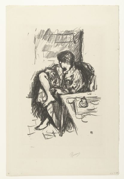 Editor: This is Walter Sickert’s ‘Study for Ennui’, currently housed at the Tate. It's a somber pencil drawing, and the title suggests it's meant to evoke boredom or weariness. What do you make of this scene? Curator: Weariness indeed! It whispers of domestic staleness, doesn't it? Look at the man, slumped, lost in smoke. The woman, detached, almost ghostly. It feels like a stage set for a play about unspoken resentments. Do you see any light in this room? Editor: No, it’s all pretty muted. The lack of strong contrast definitely adds to that feeling. Curator: Exactly. It’s not just a study; it’s a mood, a feeling caught in a web of lines. Perhaps Sickert was exploring the shadows of relationships, the quiet despair that settles in when life becomes a little too… predictable. Editor: It definitely makes you think about what's not being said. I'm seeing this work, and Sickert, in a new light.