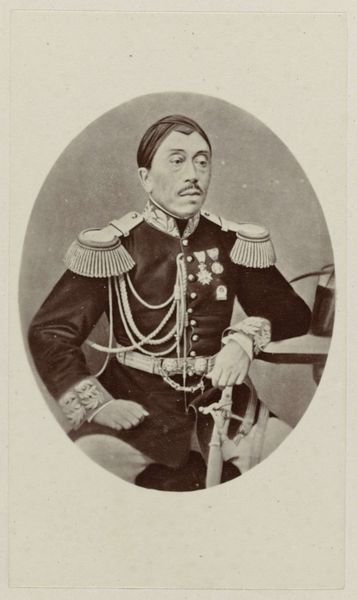 Curator: Just look at this remarkable photograph! It's a portrait of Pakoe Boewono IX, Susuhunan van Surakarta, taken sometime between 1868 and 1872 by Woodbury & Page. I am really struck by its depth and sense of timelessness. What's your initial reaction? Editor: A king in sepia tones... almost like a dream. The eyes are surprisingly gentle, considering all the regalia. What an intricate parade of ornaments. The ornamental dagger catches my eye... what’s the meaning of this symbol? Curator: The kris! Absolutely. It's more than just a dagger; it's a symbol of power, status, and spiritual potency in Javanese culture. It’s said that each one has its own spirit or energy. Editor: Ah, like a personalized force field. Look at the ornate design; so much visual storytelling! Also the sun-like brooches—it really seems to evoke not just power, but a sort of cosmic importance. The photographic treatment also fascinates me: there is an overlay of Orientalism with sharp realism. Curator: Exactly. The photographers are really trying to present the ruler in the height of grandeur. They capture the texture of his jacket, the subtle light on his face, creating a fascinating juxtaposition between cultural representation and photographic realism. Editor: I notice, however, this isn't just neutral documentation. The controlled pose, the deliberate arrangement of symbols, feels performative. Like a statement intended for a very specific audience, both domestic and perhaps...colonial. What could he want? Curator: Recognition. Legitimacy, definitely on an international stage, but also very much for the people. Think about it – photography was a new, powerful medium at the time. This portrait allows Pakoe Boewono IX to assert his presence in a modern world, using all the symbols that speak to tradition, to divine right. He also needs to represent his land’s identity under complex relationships with the colonizers. What a task. Editor: It’s like a carefully constructed image that tells a specific story of culture, identity, and maybe even negotiation of power. The picture does more than shows what things look like. It speaks. I appreciate being able to delve into those layers. Curator: A moment caught, pregnant with intent. Yes, the conversation it holds is worth diving into!