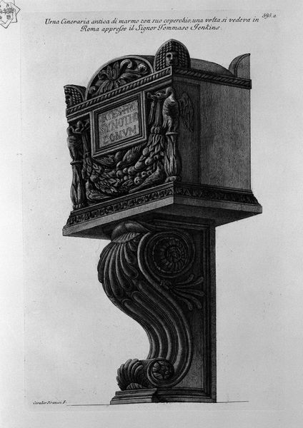 Curator: Here we have Giovanni Battista Piranesi’s “Two bases of Columns (Paul`s Basilica, Baptistery of Constantine).” Look at the incredibly fine line work, characteristic of his architectural studies. What's grabbing you initially? Editor: Immediately, it feels heavy. Like, spiritually weighty. Those intricate carvings – they're beautiful, yes, but also imposing, almost foreboding. It feels like gazing upon the ruins of something massive and powerful. Curator: That’s an astute observation. Piranesi wasn’t merely documenting these architectural details. He was interpreting them, exaggerating their scale and grandeur. Notice how the sharp contrasts of light and shadow add to that dramatic effect. We believe this drawing shows marble and possibly porphyritic columns of ancient Roman construction. Editor: The detail is mind-boggling, especially considering this is just a fragment, two sections of columns, really. The upper portion, with those small human faces staring out from the foliage... It gives a peculiar sense of personality to what is, essentially, just stone. I can almost hear whispers of the past coming from it. Curator: Precisely! Those faces, part of the decorative frieze, connect us to the human element intertwined with architectural ambition. Piranesi's Neoclassical approach blended accuracy with artistic license. Editor: It does feel theatrical, almost staged. But what stories could these column bases tell, eh? I like imagining emperors leaning against them, philosophers debating nearby... it must have witnessed millennia of life. You have to wonder what they thought, if these sculptures would still be viewed. Curator: And it's Piranesi’s masterful engraving that keeps those stories alive, centuries later, isn't it? By focusing so intently on these architectural fragments, he makes us ponder the enduring power of classical civilization, its rise, and eventual fragmentation. Editor: Fragmented, yes, but far from lost. Like a single bar from a forgotten symphony. I'll be walking around Rome, humming this column for the rest of my life.