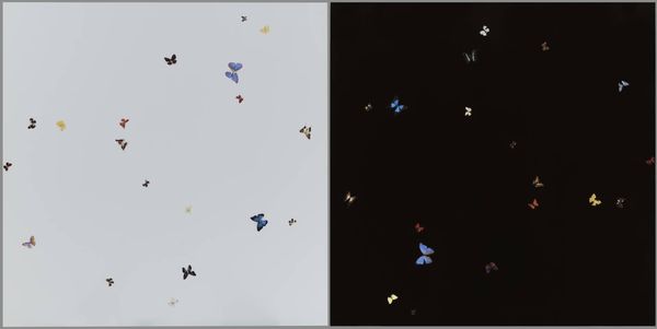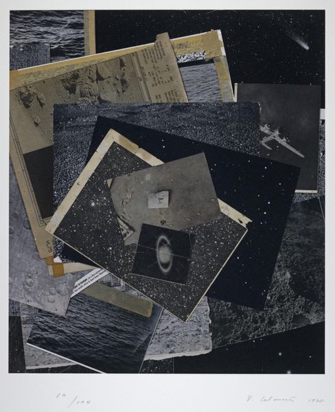 Curator: Gazing at Vija Celmins' "Concentric Bearings C" is like peering into a cosmic scrapbook. The triptych presents three distinct images: two starry skies flanking a central image of a plane. A monochrome meditation. Editor: It's undeniably evocative. My first thought? Isolation. That solitary aircraft amidst the vastness, the quiet desperation of stars. The world is so immense and the airplane seems so small in comparison. Curator: Celmins' work often explores detachment through meticulous reproduction. This print, housed at the Tate, speaks to the allure and terror of the unknown. Editor: The plane, though a symbol of human ambition, feels vulnerable here. Is it about the romance of flight or the dark potential of technology? Or, perhaps, the fleeting nature of human existence against the backdrop of infinity? Curator: Perhaps it's both. These mirrored starscapes also suggest a cyclical nature to it all. Editor: Right. And those stark, contrasting blocks of black and white make it feel like a memory, something seen and then half-forgotten, leaving only a feeling of unease. Curator: It's amazing how a piece can be both aesthetically beautiful and emotionally unsettling. Editor: Agreed. It is a stark reminder of how small we really are.