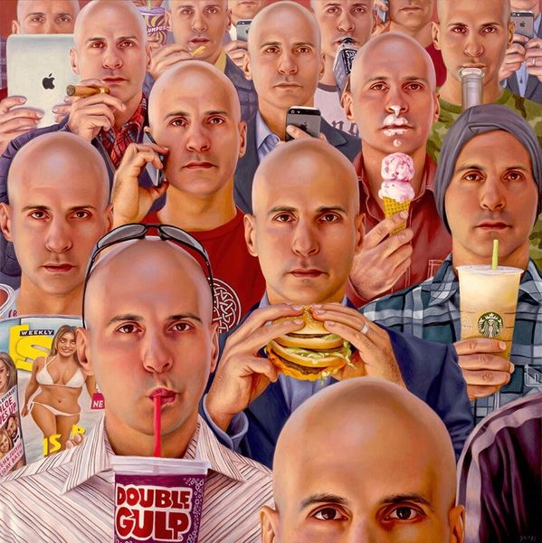 Editor: So, this vibrant acrylic painting is called "Trash" by Alex Gross. It presents a massive compilation of pop culture villains nonchalantly enjoying junk food. There's something darkly humorous about it. What do you see in this piece? Curator: I see a powerful commentary on cultural consumption. Gross brings together figures who, in their respective narratives, embody destruction and excess. Yet here, they are rendered mundane, their villainy diluted by the very products they consume. The symbols of power they wield are juxtaposed against symbols of disposability. It's an ironic mirroring, wouldn't you agree? Editor: Definitely. Like, Darth Vader drinking from a juice box – the mundane intruding on the iconic. How does this juxtaposition affect the cultural weight of these characters? Curator: It humanizes them, almost defangs them, but not entirely. We're so used to seeing these characters in the context of their power that stripping that away and replacing it with something banal forces us to reconsider their cultural role. Are they truly menacing or are they just another cog in our consumption machine, ultimately disposable 'trash' themselves? Editor: I guess they become reflections of our own appetites. Curator: Precisely! It speaks to a cyclical relationship between our desires, the villains we create, and the 'trash' they—and we—consume. Do you see any specific food items that seem particularly symbolic? Editor: Well, the Joker with the energy drink seems fitting, like he’s mainlining chaos. Thanos drinking a soda—maybe implying that even universal dominance gets reduced to simple pleasures? Curator: Indeed. These pairings create a potent visual language, highlighting the absurdity of our cultural fixations. The image resonates because we, the viewers, are also complicit in this consumption. We're feeding the very monsters that reflect our desires. Editor: So it's a self-portrait, in a way, of a culture obsessed with its own dark side? Curator: An unsettlingly accurate one, I believe. It reveals an uncomfortable truth: we often define ourselves by the villains we create and consume. Editor: Wow, I’ll definitely look at the painting differently now. It is so much more layered than just villains eating donuts.