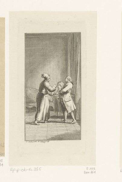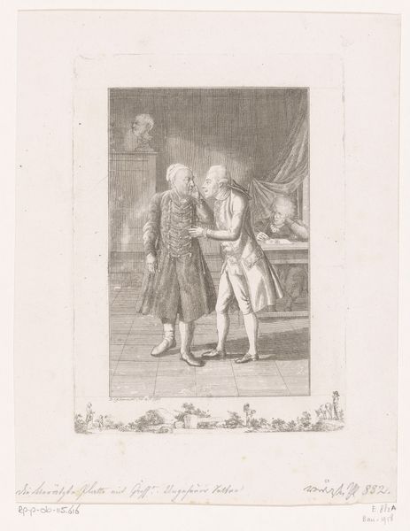 Daniel Nikolaus Chodowiecki etched "Webson en Dr. Braun naast de buste van Wilhelmine Arend" with delicate precision. Observe the central figure, a bust, a symbol of remembrance and honor, placed as a focal point between the living figures of Webson and Dr. Braun. The act of commissioning a bust has ancient roots, hearkening back to Roman practices of immortalizing esteemed individuals. Yet, its significance evolves. In ancient times, a bust might represent political power or divine status. Here, it signifies something more intimate: the personal value of Wilhelmine Arend, kept alive through art. Consider how, across centuries, the human desire to preserve memory manifests. From Egyptian sarcophagi to modern portraiture, the impulse remains constant. This act of memorializing bridges the gap between mortality and legacy. It reveals our deep, collective need to defy oblivion, to find solace in the enduring presence of those we cherish.