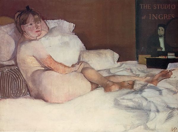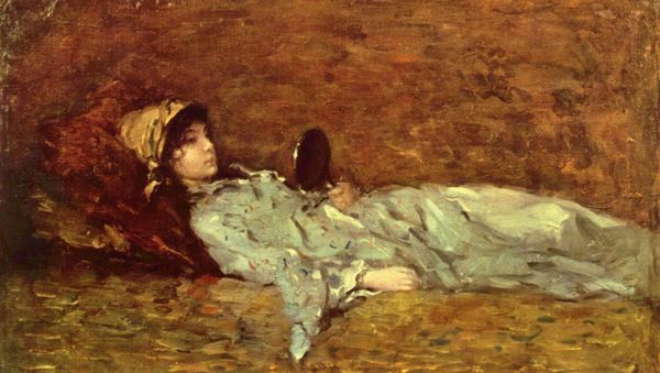 Curator: This is James Abbott McNeill Whistler's "Note in Red, The Siesta," created around 1875. It’s an oil on canvas. Editor: My initial impression is of such blissful languor. The impasto gives it an almost dreamlike quality, the sitter merging with the furniture. It's lovely! Curator: The piece captures a very modern theme of domesticity. I think there's also an intriguing tension in Whistler's embrace of painting "en plein air" within the private, indoor space of a leisurely boudoir. Editor: Yes, there is that interplay between interior and exterior, or maybe, production and rest? Note how the dress appears almost sculpted from thick paint, those bold brushstrokes build the materiality right into her repose. The labor to simulate such a simple act is so prominent here. Curator: Exactly! There is a direct honesty in Whistler's rendering. Perhaps he's not trying to glamorize the act of "siesta," or is maybe even pointing at its performance for artistic consideration? It begs the question – what sort of emotional labor are we asking women to enact in their domestic, private spaces? Editor: I love how you bring up emotional labor. And Whistler, that notorious dandy himself, wading into that territory! Looking at how he deploys oil paint and textures – heavy layers in some spots, bare canvas peeking through in others – highlights, I think, his conscious choices and deliberate omissions as well. He directs the gaze through surface tensions. Curator: Ultimately, though, "The Siesta" is a moment captured, a pause, wasn't it? A reminder to us to find beauty in stillness. I suspect many people still find joy in finding those fleeting instances, don't you? Editor: I suppose. The way he handles paint also speaks of luxury: thick dollops mimicking opulent textiles. It points to the sitter's economic position, the very real and material comforts that allow one a midday rest. It’s about showing, and having it. Curator: Thinking about the sheer pleasure evoked by the image...it is impossible not to feel pulled into this dreamy state...perhaps, the real key of art making! Editor: Indeed. Looking beyond just the subject and delving into the sheer construction reminds us how inextricably linked material culture is to our emotions and lived realities.