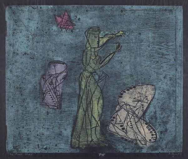 Curator: Right, let's talk about Jason Limon's "Good Luck" from 2021, done with mixed media. The piece grabs you instantly, doesn't it? Editor: It's deliciously morbid! A kind of cute memento mori. The palette is very contained – teals, blacks and browns—that gives the overall effect an unexpected coziness, if that's possible with skeletons! Curator: Well, the charm lies in the details and how they connect to wider visual culture. Notice how Limon borrows motifs from vintage typography and playing card designs. The skeletons almost feel like afterthoughts amidst all this bold, graphic lettering. He turns these grim symbols of death into whimsical reminders. Editor: You're spot on about the typography. It reminds me of old advertising, you know, the kind that promised miraculous elixirs and sure-fire schemes. And using skeletons as little mascots. It flips the script entirely, from an elite art canon. Curator: Exactly! The composition—it’s separated into almost equal sections – gives the impression of a child’s game of chance, whilst the speech bubbles, filled with phrases like "Good bye" and "Have fun!", lend the work this bizarrely cheerful nihilism. Editor: You put that so well! And notice how the artist presents the imagery on an equal stage: the hand-crafted elements mimicking cardboard almost challenge traditional artistic boundaries, almost a punk or ‘DIY’ gesture. Curator: It is tempting to ask what the artist is trying to tell us about modern capitalism with its pursuit for luck and relentless consumerism. The layered effect invites a slow decode and consideration of themes from fortune to chance. Editor: Absolutely, that hits the spot. I almost forgot to say it's given me a lot to think about. The blending of nostalgia and macabre humor – quite haunting and effective, actually. Curator: Limon creates space to play with darker themes that many might find intimidating at first glance, but that instead evokes humour with careful execution. "Good Luck", what a title to summarise our existential lottery ticket!